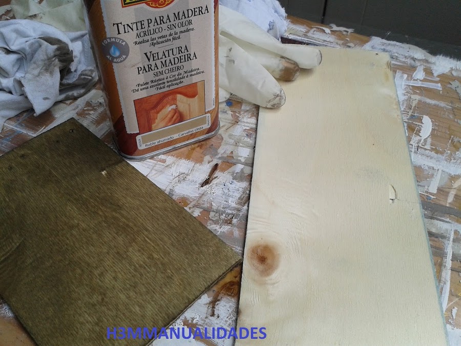 Lo he hecho a partir de una tabla de una caja grande de fruta. La he cortado y la he teñido primero con un tinte color "roble ahumado" (previamente, limpiar, lijar,...)