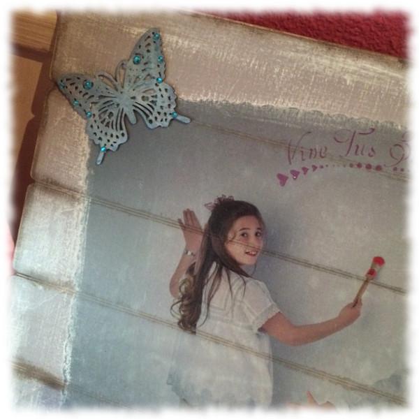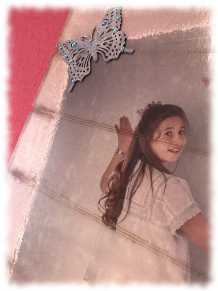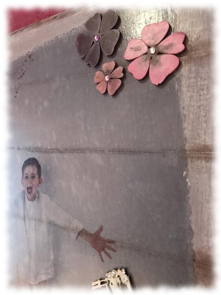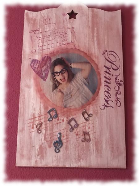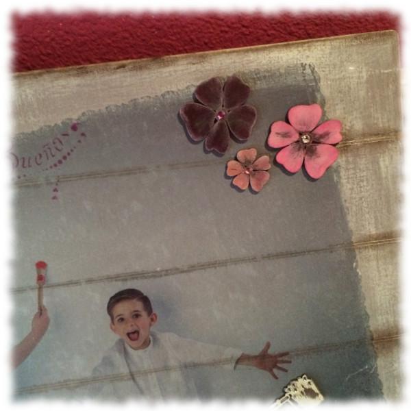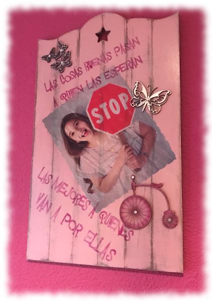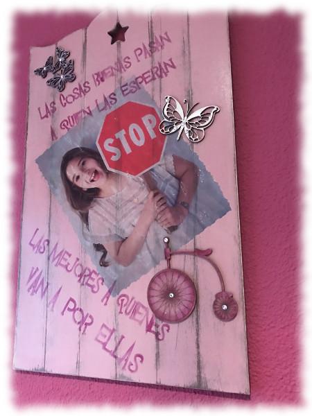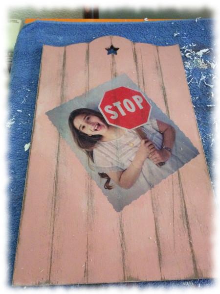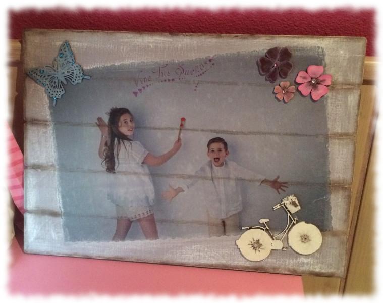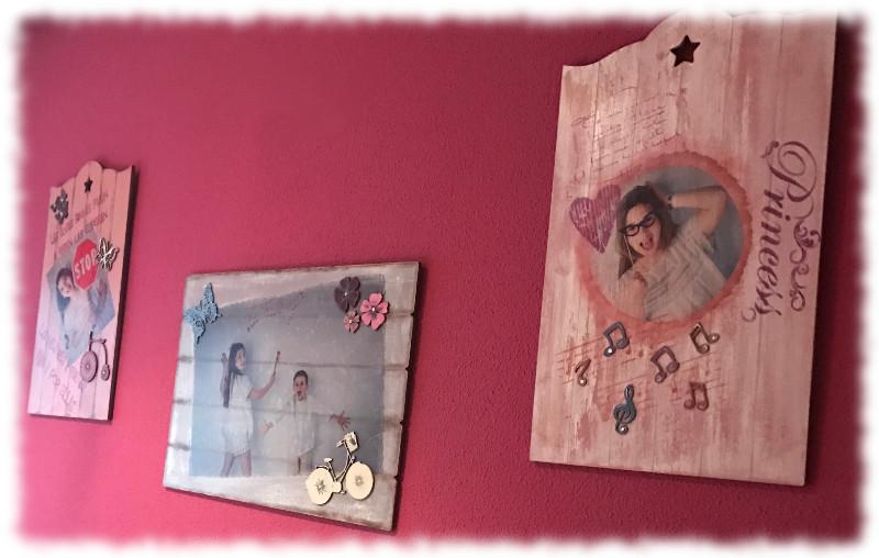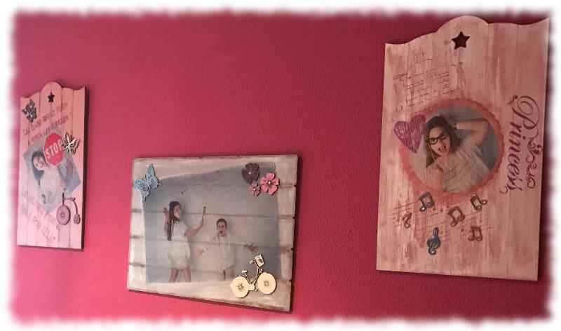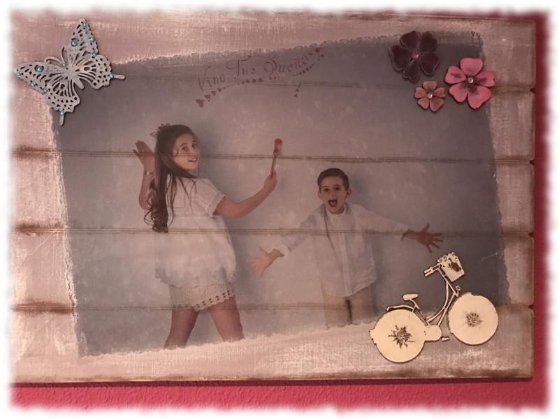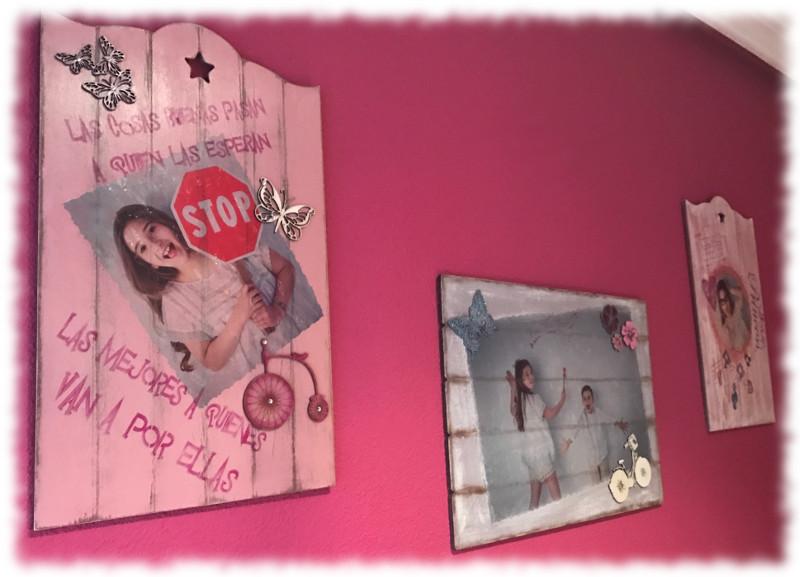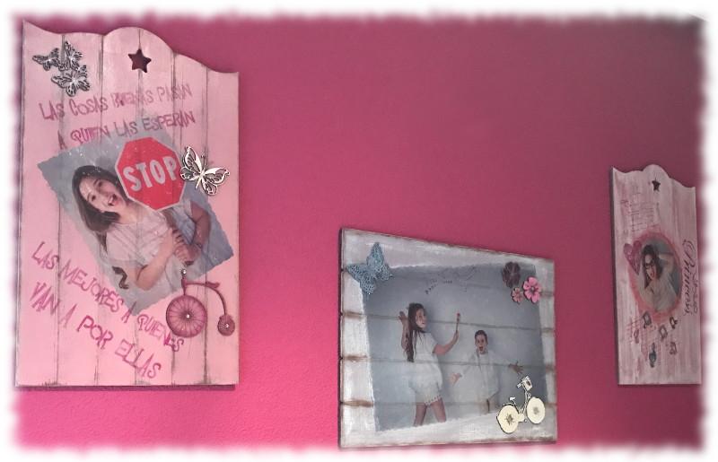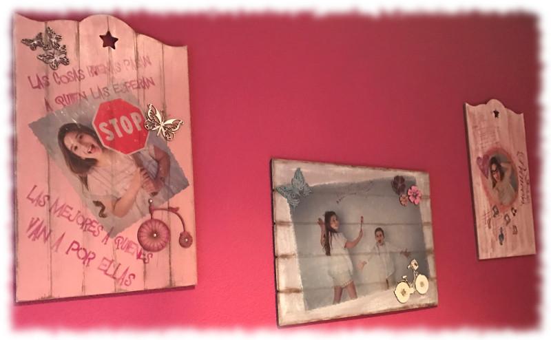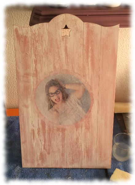 1. Como os comentábamos al principio, teníamos el encargo de hacer unas tablillas de DM con unas fotografías de niñ@s transferidas en ellas. No se trataba de transferir la imagen y ya está, sino que había que darle un color de base y unos detalles para realzarlas. Por consiguiente, preparamos las tablillas con un color de base en tonos rosas, al tratarse de una niña, que también tenía decorado el dormitorio en esos tonos.