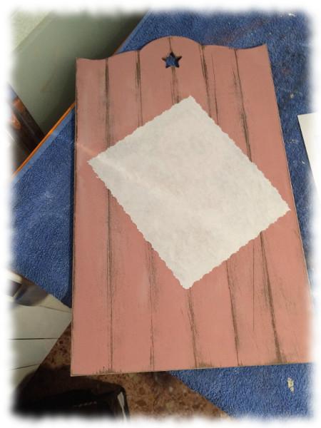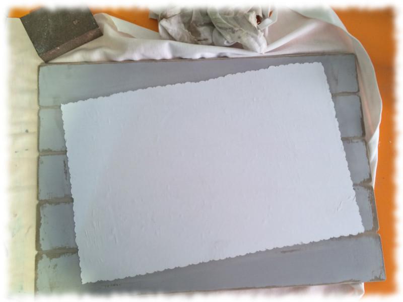 3. Presentamos la hoja con la imagen sobre la tablilla para decidir la posición y hacemos unas marcas guía casi imperceptibles, que nos sirvan de referencia del cómo y dónde va a ir el #Transfer. Retiramos la hoja y procedemos a untar con suficiente producto de #Transfer la superficie donde va a ir ubicada la imagen, sin miedo a salirnos de los límites de la misma, ya que así nos aseguraremos de que los bordes de la hoja no queden fuera de la zona tratada.