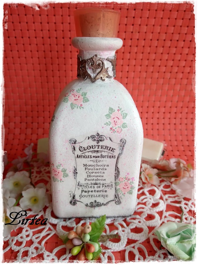Es un método ideal para hacer transferencias en cristal, ideal para transferir nuestras propias etiquetas y pegarlas en los botes o frascos de cristal. Os recomiendo la entrada de mi amiga Isabel Vintage en la que hace unas transferencias de etiquetas ideales. Pero vamos con mi botella