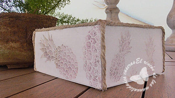 Las impresiones que he utilizado son de temática tropical para decorar en verano, como protagonista la Piña y tiene un motivo y es porque estoy participando en una colaboración junto a unos blogs amigos, muy amigos, grandes artistas y cada uno de ellos nos trae una idea con esta temática las Piñas, aquí os dejo una foto y todos los enlaces para que podáis ir a ver sus creaciones.