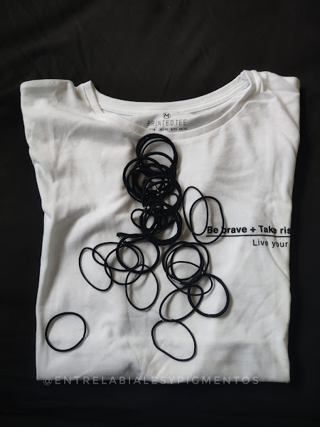 -Segundo, preparamos la camiseta haciendo unos "moñitos" con gomas. (En este caso, podemos usar gomas de pelo (negras), gomas de plástico...).