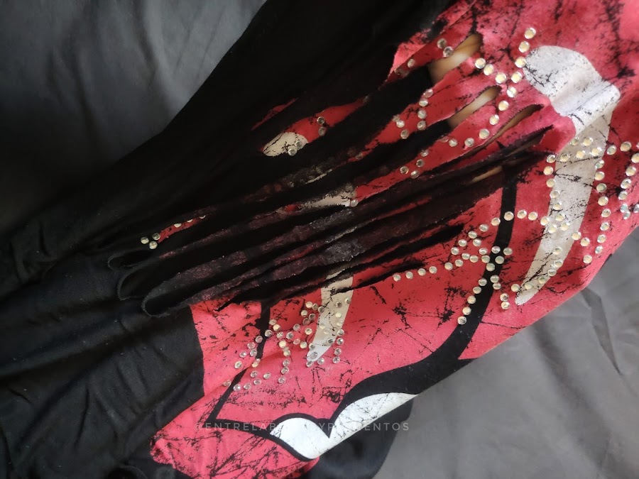-Primero buscamos una camiseta antigua que esté algo deteriorada. Yo en mi caso, tenía esta de los Rolling que compré en Primark hace 8 años y me encantaba pero claro, ya hace muchísismos años que la tengo y estaba algo deteriorada. Buscando ropa en Shein encontré una camiseta con unos cortes muy chulos pero a un precio algo elevado (8€) para ser tan sencilla. Era una camiseta con unas letras y los cortes, así que se me ocurrió buscar en el canapé de la cama entre la ropa antigua y encontré la camiseta ideal para esto así que me puse manos a la obra.