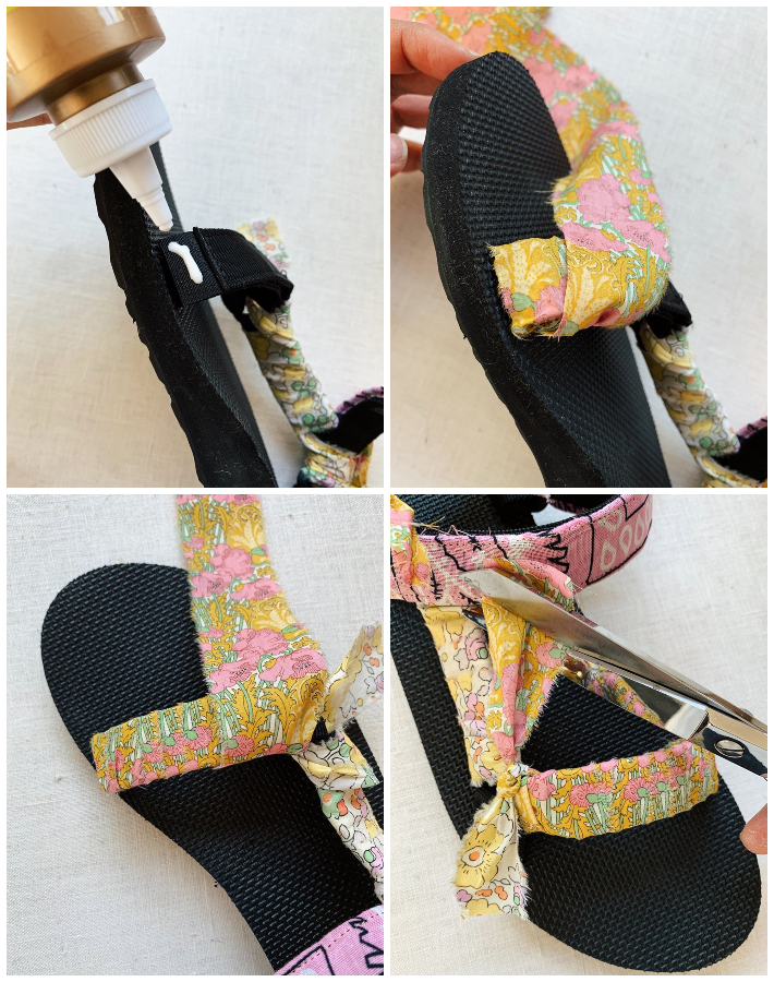 Por último, envolveremos la correa del dedo del pie. Una vez que la correa esté ajustada y cerrada, agregamos una gota de tela o pegamento pegajoso al final de la correa del dedo del pie. Colocamos el extremo de la tela sobre el pegamento, lo más cerca posible de la base del espectáculo. Luego, comienzamos a envolver la tela.