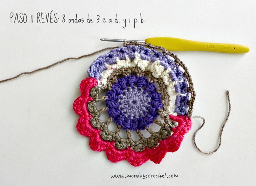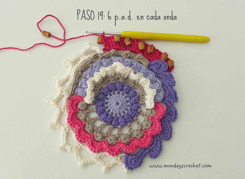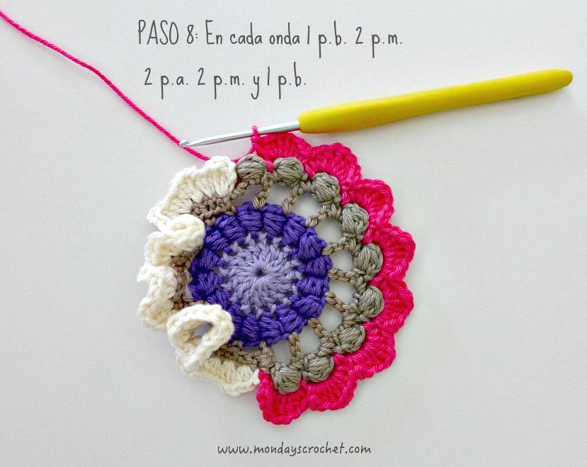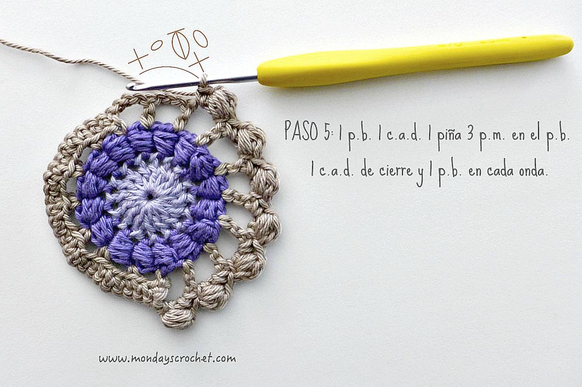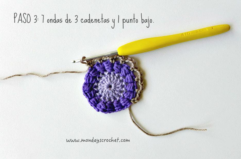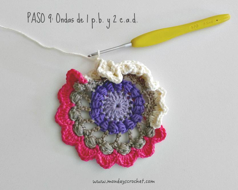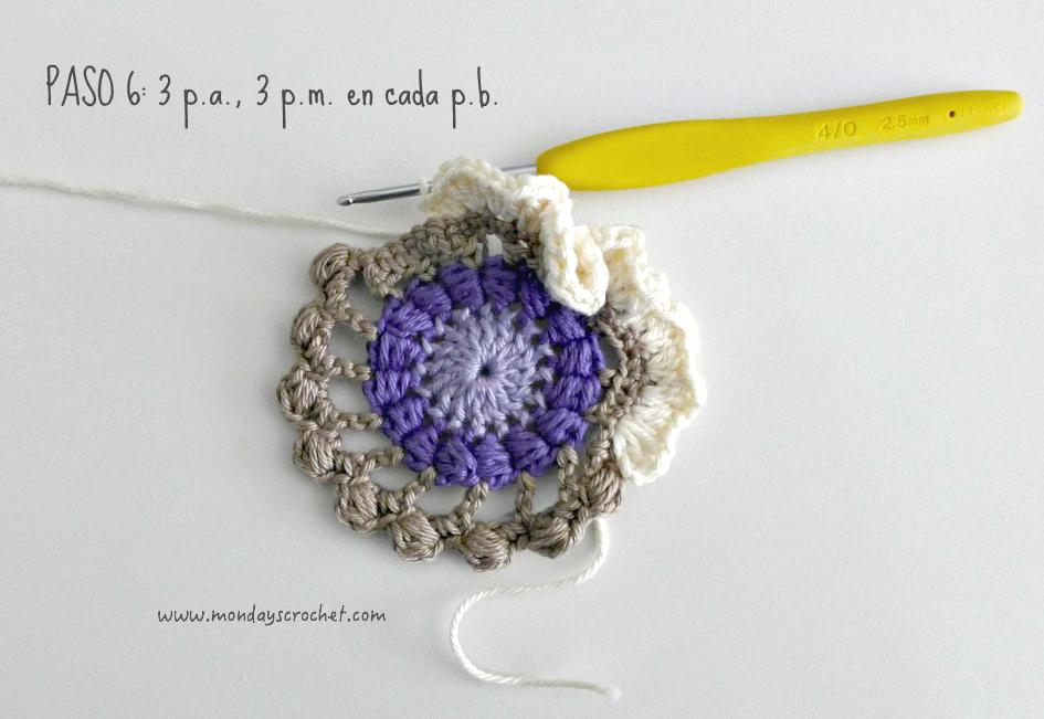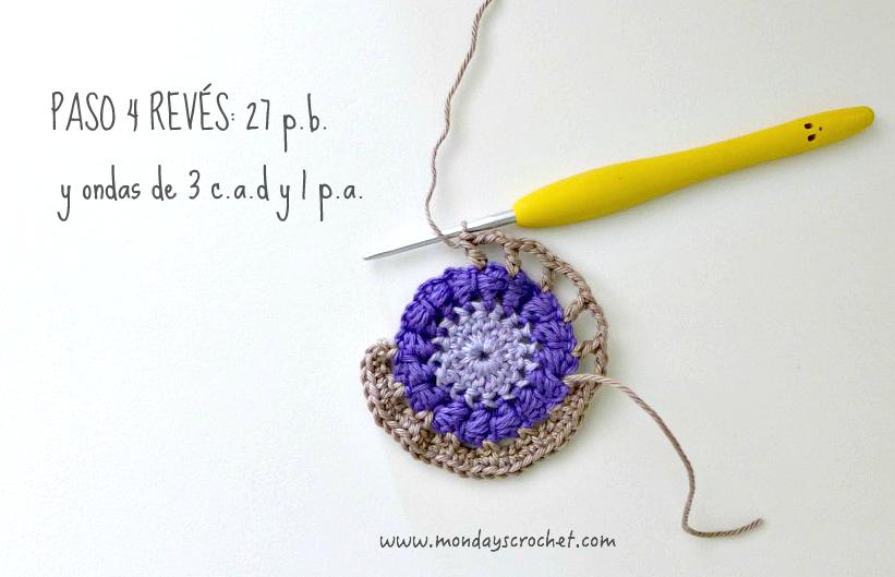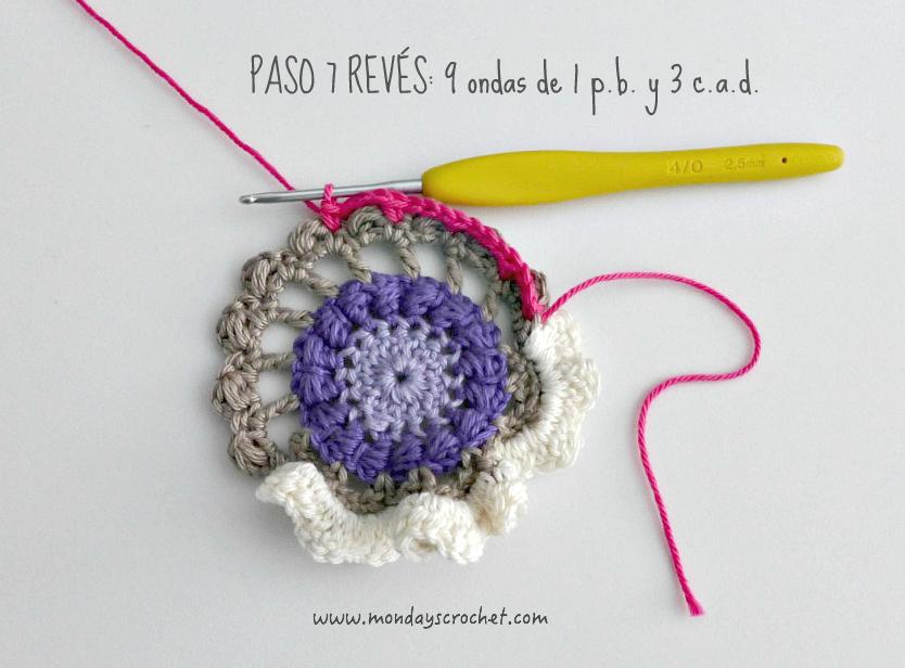 PASO 3 DERECHO: En cualquier c.a.d. de separación entre un PA del paso anterior, tejemos 1 c.a.d. de subida que cuentan como 1 p.b. y 3 c.a.d. Repetimos. En total 7 ondas de 1 p.b., 3 ca.d. PASO 4 REVÉS: Tejemos p.b. por la lazada delantera de los puntos del paso anterior. En total 27 p.b. Continuamos por el resto del círculo con ondas de 1 p.a., 3 c.a.d. En total 9 ondas de 1 p.a., 3 c.a.d. Cerramos con 1 p.c. PASO 5 DERECHO: En las ondas del paso anterior, tejemos 1 p.b. 1 c.a.d. 1 piña de 3 p.m. 1 c.a.d. de cierre y 1 p.b. Repetimos en todas las ondas. Con color marfil.