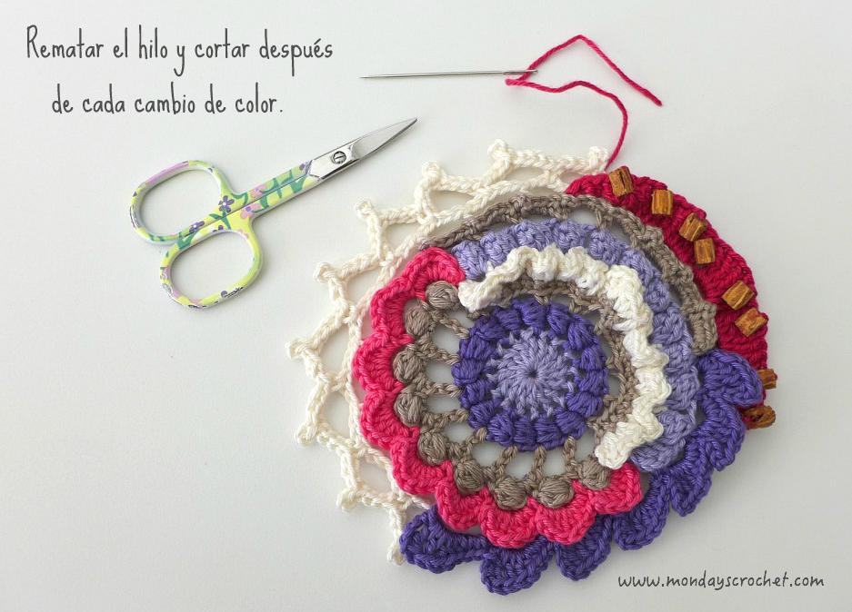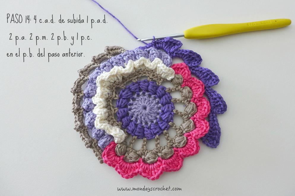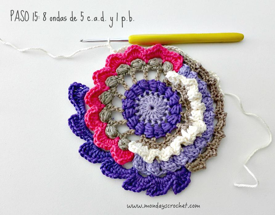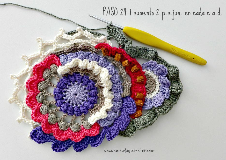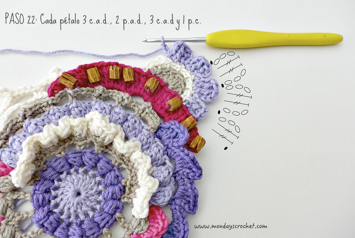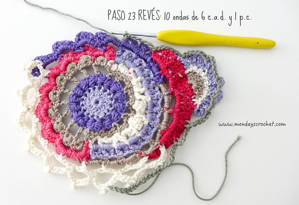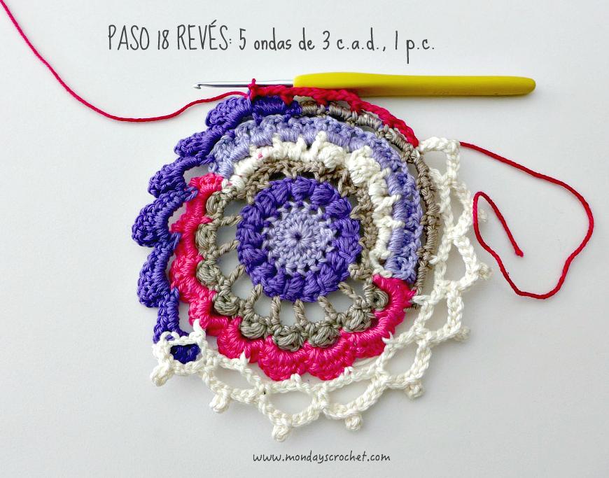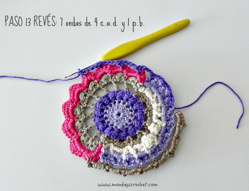 PASO 3 DERECHO: En cualquier c.a.d. de separación entre un PA del paso anterior, tejemos 1 c.a.d. de subida que cuentan como 1 p.b. y 3 c.a.d. Repetimos. En total 7 ondas de 1 p.b., 3 ca.d. PASO 4 REVÉS: Tejemos p.b. por la lazada delantera de los puntos del paso anterior. En total 27 p.b. Continuamos por el resto del círculo con ondas de 1 p.a., 3 c.a.d. En total 9 ondas de 1 p.a., 3 c.a.d. Cerramos con 1 p.c. PASO 5 DERECHO: En las ondas del paso anterior, tejemos 1 p.b. 1 c.a.d. 1 piña de 3 p.m. 1 c.a.d. de cierre y 1 p.b. Repetimos en todas las ondas. Con color marfil.