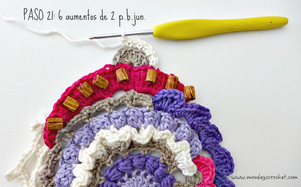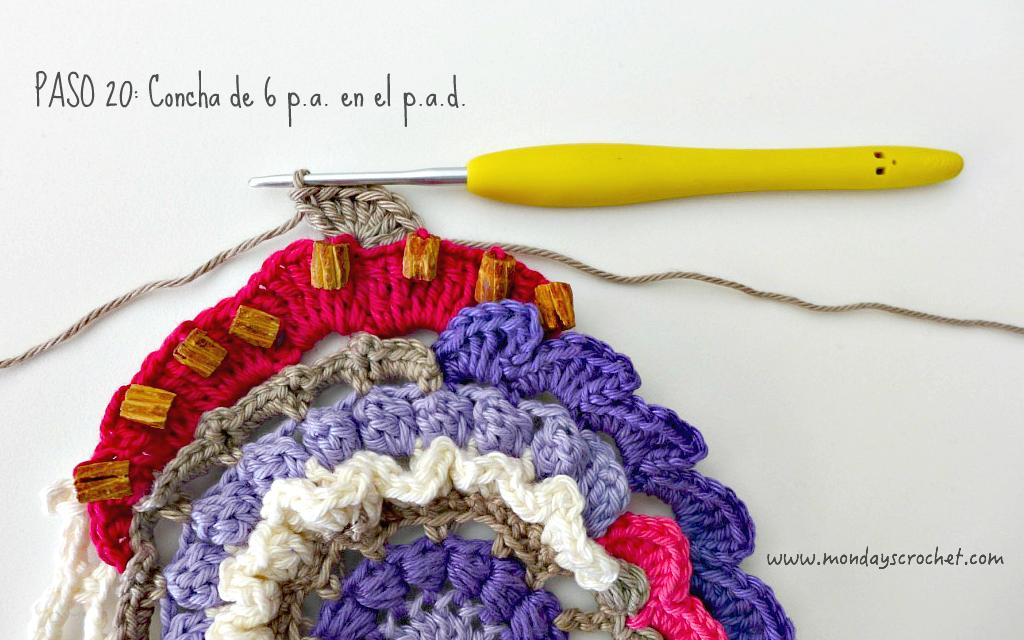PASO 18 REVÉS: Comenzando en la primera onda del paso anterior. Tejemos 1 p.c. detrás de cada piquillo del PASO 12, 3 c.a.d. y 1 p.c. En total 5 ondas de 1 p.c., 3 c.a.d. Con una aguja lanera insertamos en el hilo 8 cuentas de madera. PASO 19 DERECHO: Tejemos 6 p.a.d. en cada onda del paso anterior. Insertamos una cuenta en la última hebra cada 4 p.a.d. Terminamos con 1 p.a. y 1 p.c. Rematamos con la aguja lanera y cortamos con las tijeras el hilo sobrante en cada cambio de color. PASO 20 DERECHO: Insertamos el ganchillo por la lazada trasera del décimo p.a.d. del paso anterior, saltamos 2 puntos y en el tercero tejemos una concha de 6 p.a., saltamos otros 2 puntos y cerramos con 1 p.c. Con color marfil.