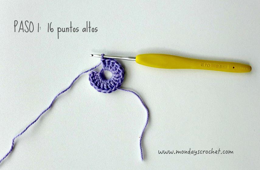 PASO 1 DERECHO: Tejemos 3 c.a.d. de subida que cuentan como 1 p.a. y 15 p.a. En total 16 p.a. Cerramos con 1 p.c. Después de cada paso rematamos con una aguja lanera y cortamos con tijeras el hilo sobrante.