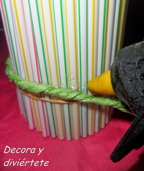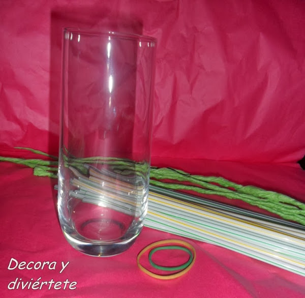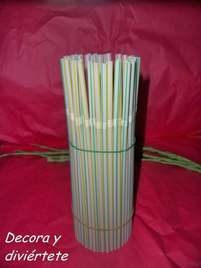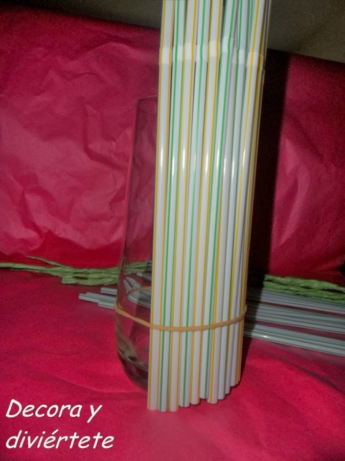 1- Tenéis que poner un goma en la parte baja del vaso e ir colocando las pajitas ( sin pegarlas )