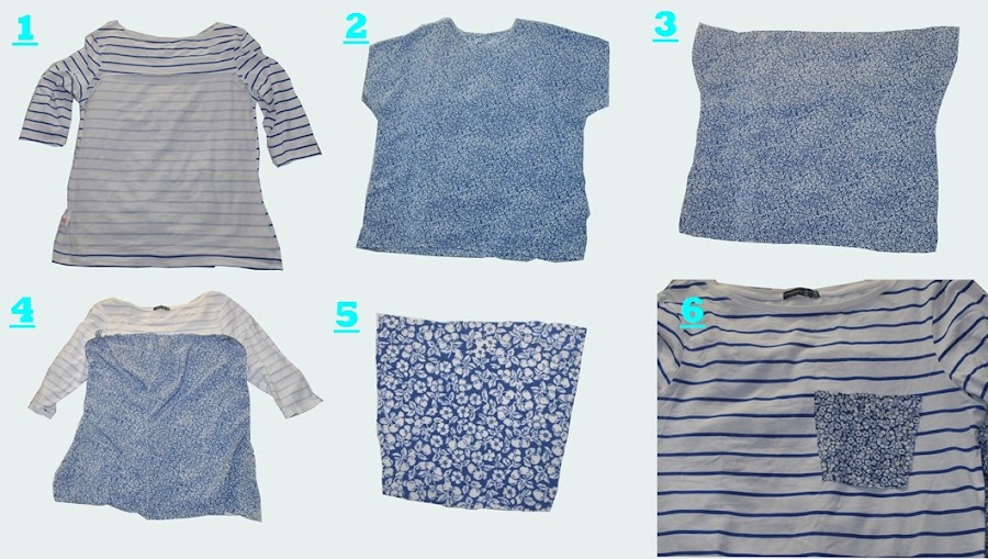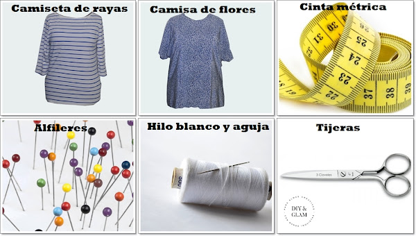 Pero no encontraba la tela con el estampado ideal para la camiseta de rayas. Y oh que casualidad..... cae en mis manos una camisa de flores con los mismos colores que la camiseta.