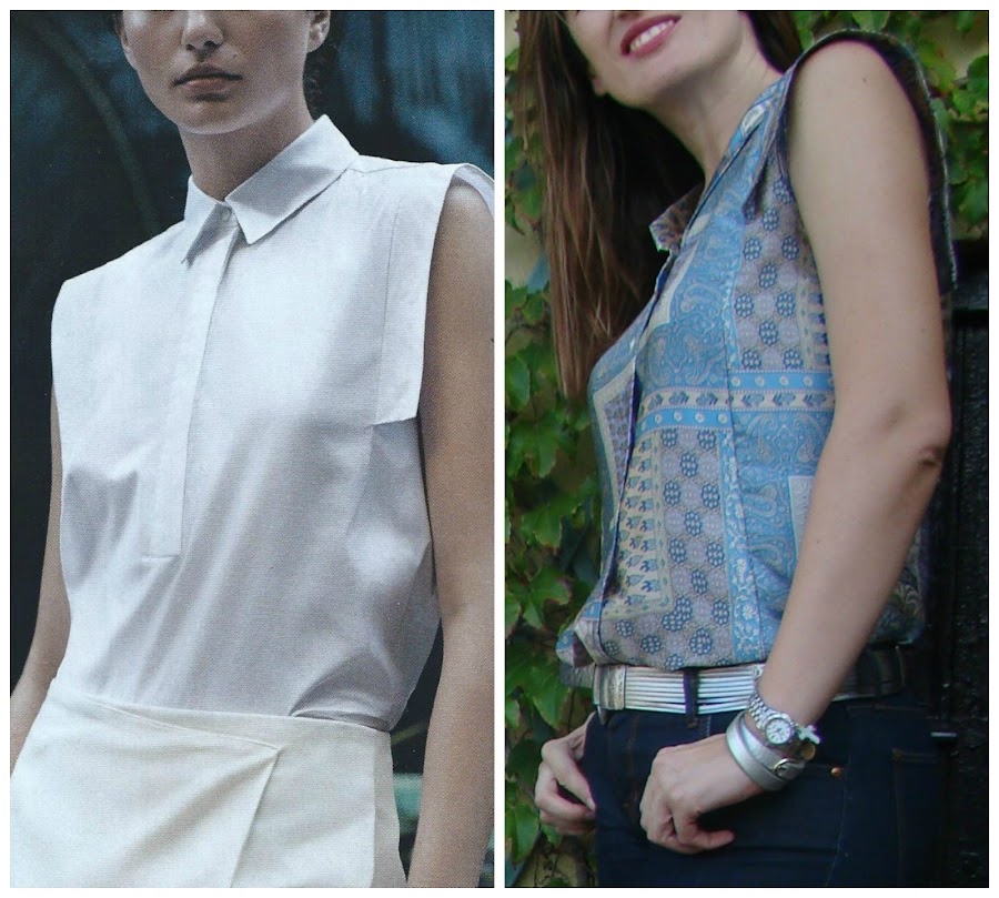En la cabeza tenía una blusa de Mango, con unas tiras cosidas y vueltas que hacían las veces de manga y que salían de unos costadillos finos y muy laterales. Eso y una forma no muy ceñida y un poco larga para poderla llevar por dentro sin problemas.