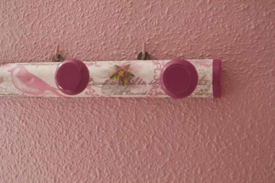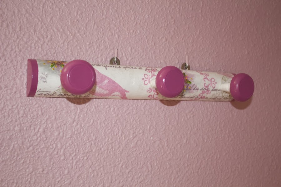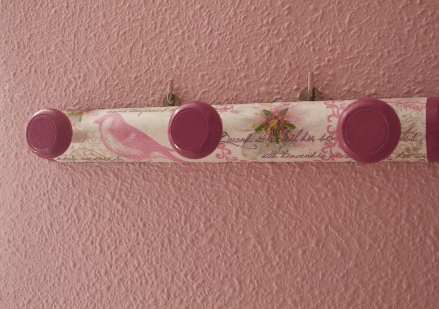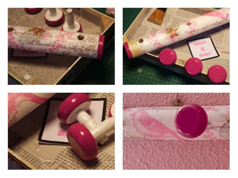 Había dudado sobre como pintar los colgadores, pero cuando vi la servilleta pegada decidí que los pintaría de un rosa intenso, y también el extremo de la percha. Creo que le da un toque armónico al conjunto.