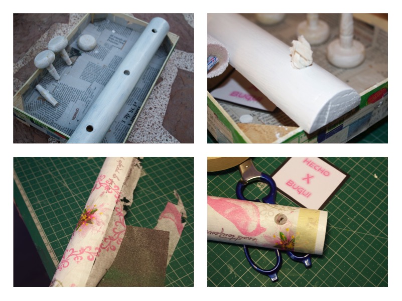 Una buena lijada para quitar la pintura, o por lo menos una parte ya que estaba pintada como se pintaban antes las cosas, capas y capas. Tapé los agujeros para que no entrara pintura ya que después me hubiese costado meter los colgadores. Después una imprimación blanca y una lijada suave, a continuación un par de capas de pintura acrílica blanca a toda la superficie.