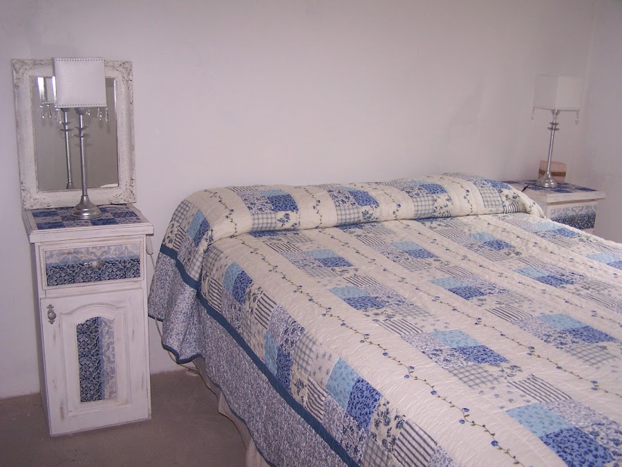 Dos viejas mesas de luz de pino. Despues de varias lijadas, pintura, efecto gastado, decoupage y envejecimiento, ahora hacen juego con mi acolchado.