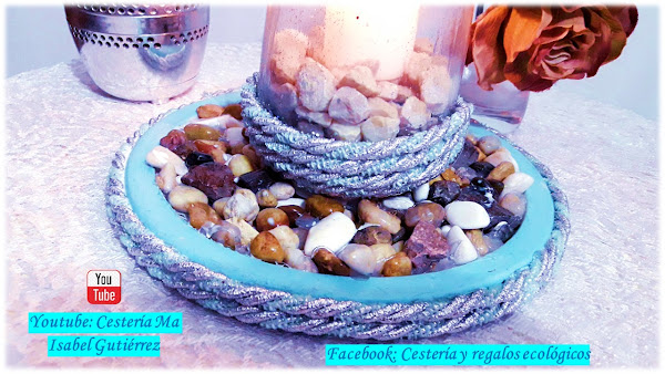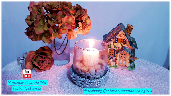 También, si tienes un vaso de vidrio que ya no uses, lo convertiremos en este elegante porta-velas usando las piedras pequeñas y un poco de cordón o tira de pasamanería...