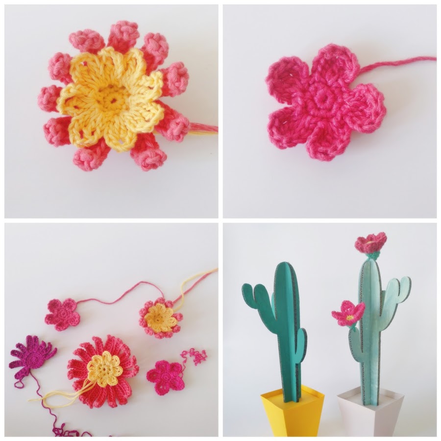 Ya sabes que soy adicta a ellos, me encantan y siempre que puedo tejo alguno nuevo. Pues bien, estos cactus no los tengo que tejer, pero si puedo personalizarlos haciendo algunas flores de ganchillo para darles más vida.