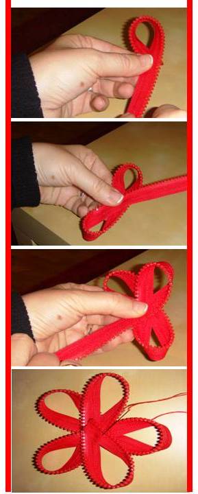 con el resto de tira, hacer pétalos (5) tal y cómo se ve en la figura, dejando los dientes de la cremallera siempre para fuera del pétalo