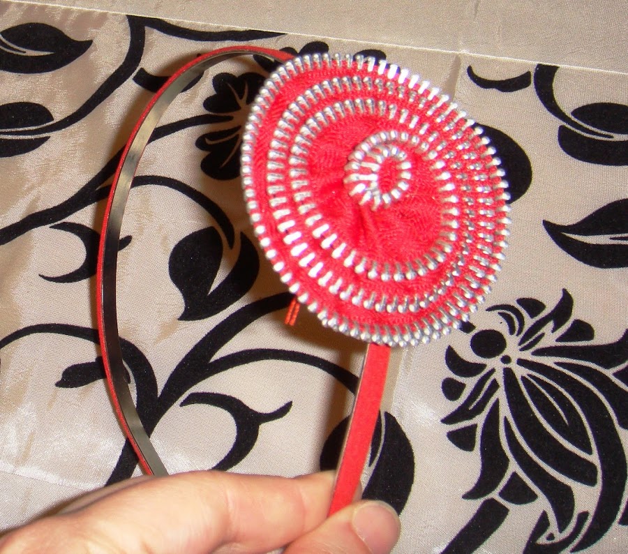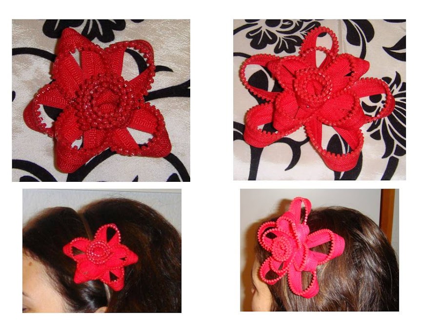 Una vez que la flor esta hecha (ya sea la pequeña o la grande) se pega por detrás un circulo de fieltro del mismo color que la cremallera sobre el que pegamos el cierre del broche o la pegamos a la diadema. y ya está todo hecho!!