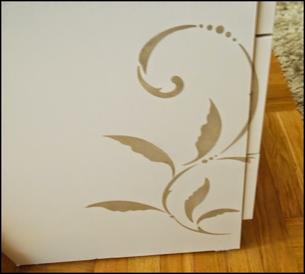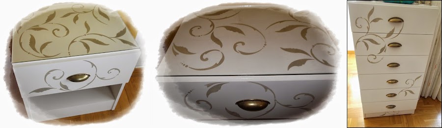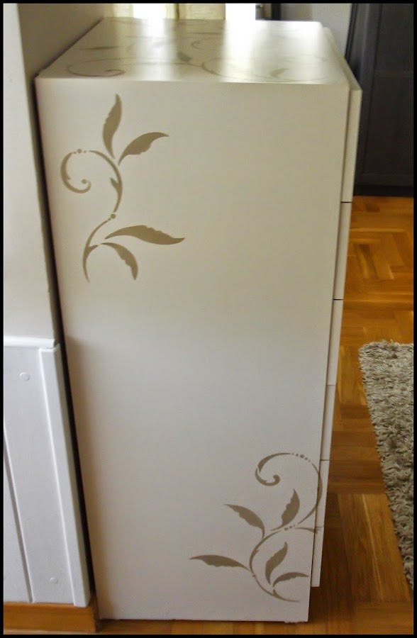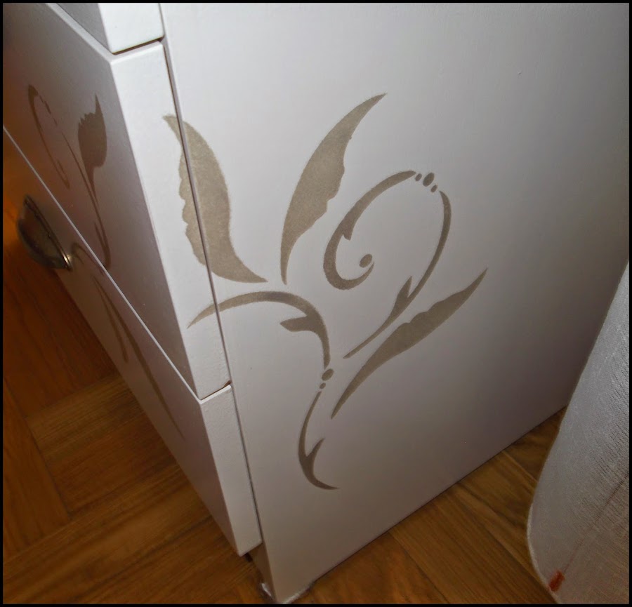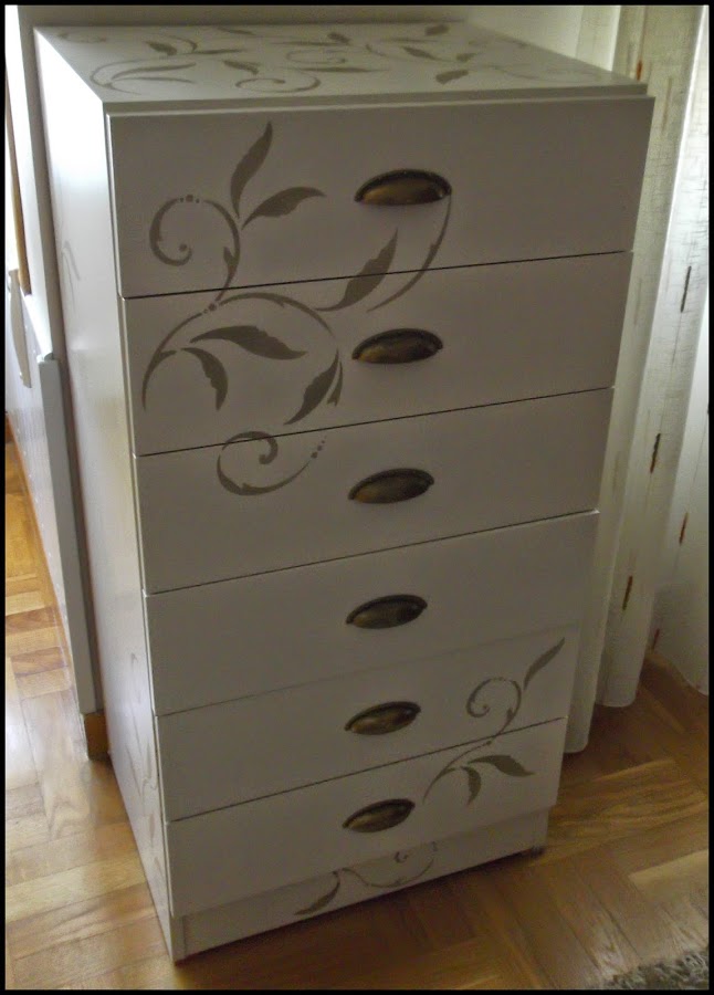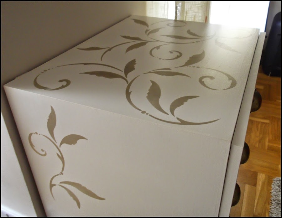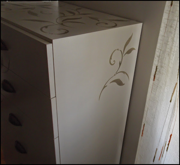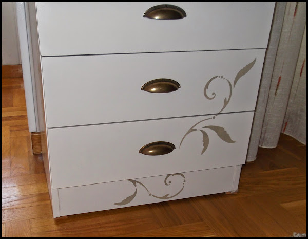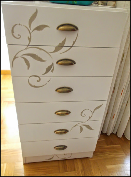 En los laterales, los estarcidos los prolongué por los bordes de los cajones. Me resultó difícil, pero el efecto visual quedó muy bien ¿no os parece?