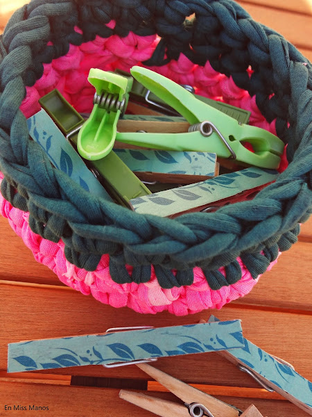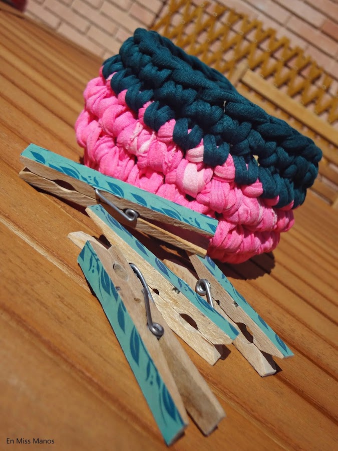 Había hecho una del mismo trapillo para las pinzas de la ropa, pero el sol se comió todo, todo el color, y había que cambiarla, así que le he cambiado la forma también, la otra era ovalada.