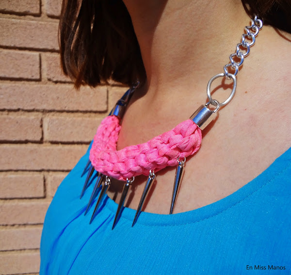 También para aprovechar el trapillo y como me gustó mucho cómo quedó el collar de trapillo azul, me he hecho otro pero cambiando el tipo de cadena y añadiendo unos pinchos plateados que tenía en casa.