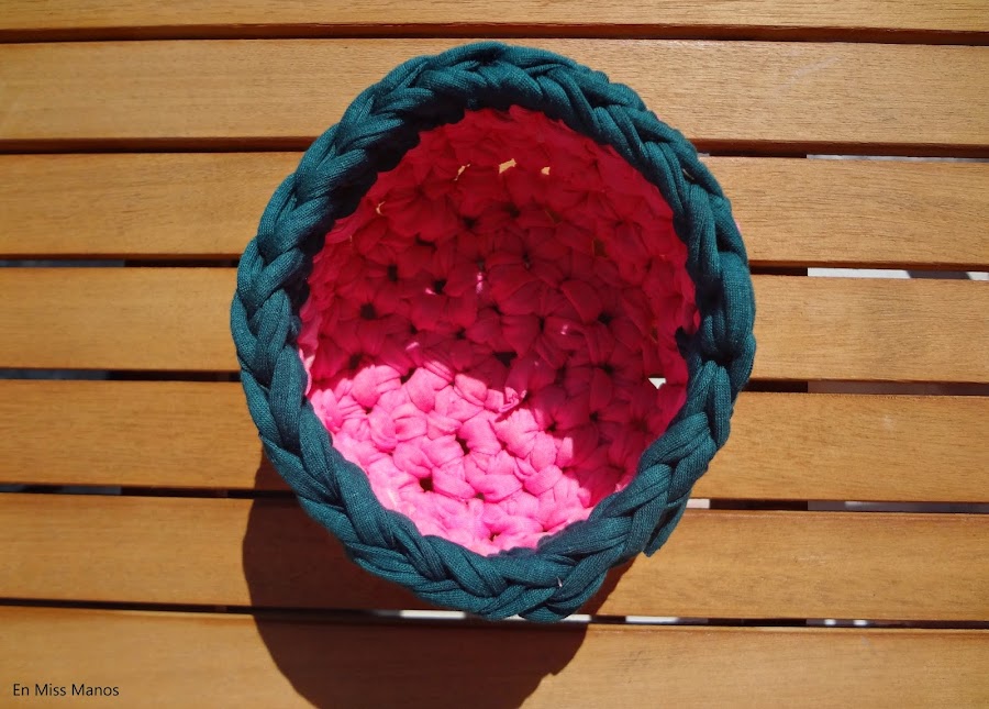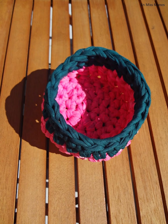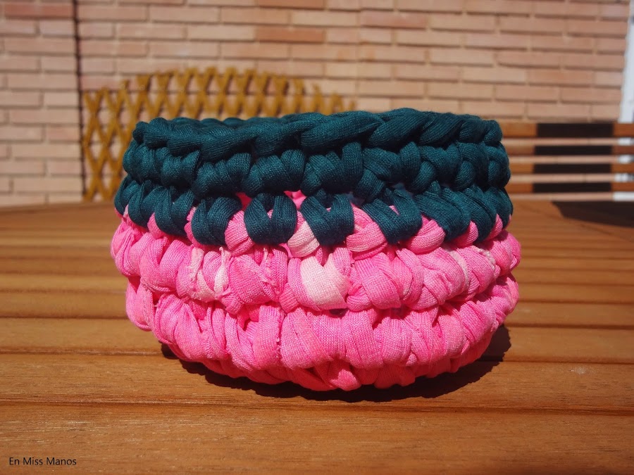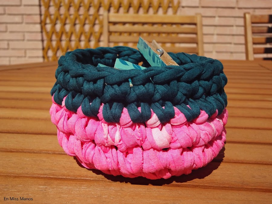 En primer lugar he hecho una cestita de trapillo en color rosa flúor, que compré el verano pasado, cuando se pusieron de moda éstos colores y todavía me quedaba.