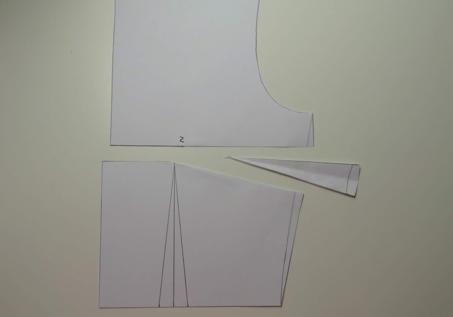 Y cortamos por la línea que dibujamos de traslado, así abrimos nuestra nueva pinza y aplanamos el patrón. Ese corte tenemos que hacerlo justo hasta el centro de pecho, que es donde se forma el pico.