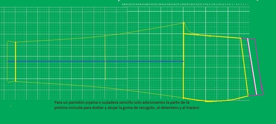 Uniendo el corpiño delantero básico con el de pantalón tenemos la parte delantera con los aumentos de amplitud y movilidad. Se traduce en un tiro mucho más largo de lo normal. Igualmente lo haremos con la espalda