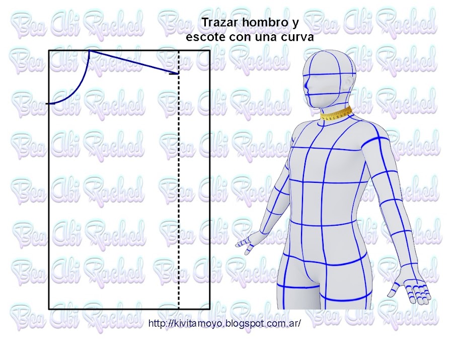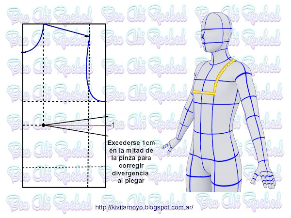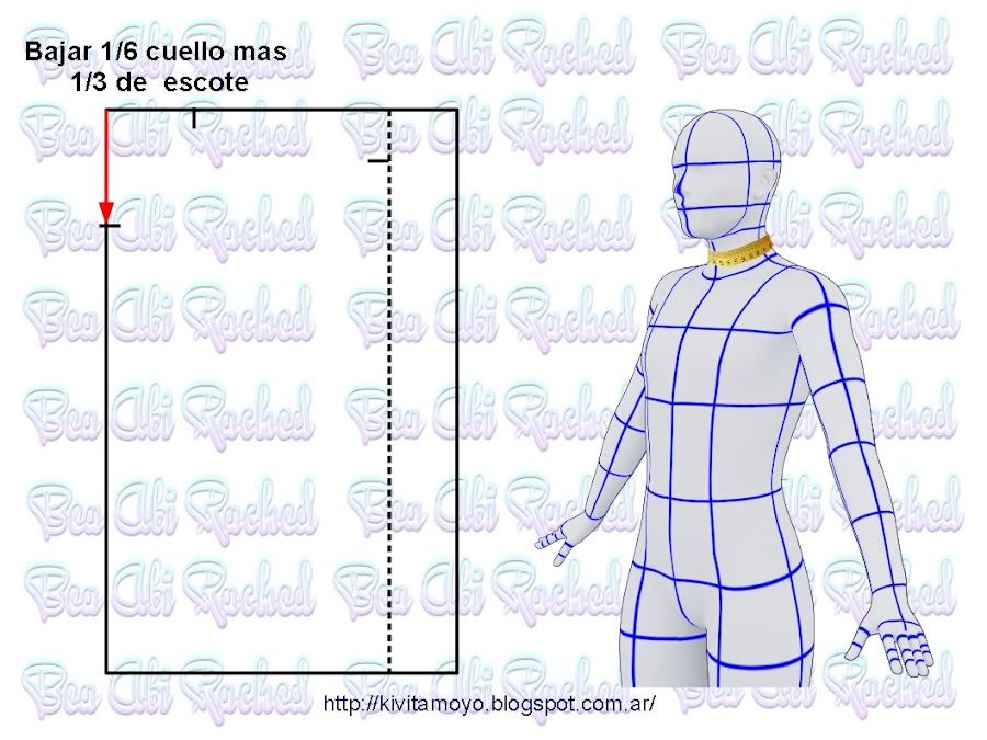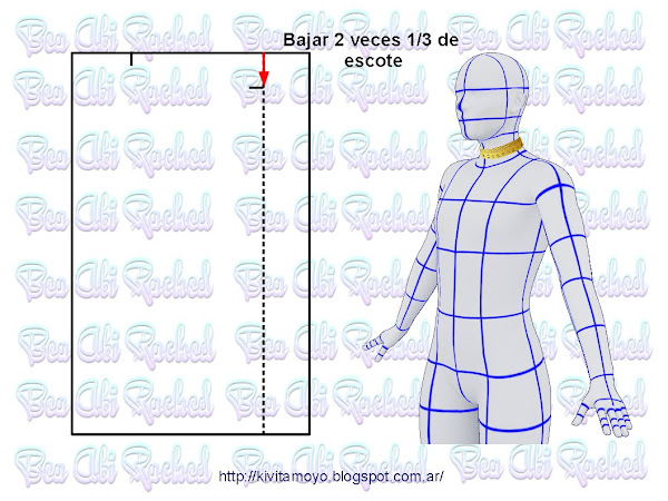 A diferencia del trasero no elevaremos 1/3 en el escote, y la bajada de hombro seran dos veces ese tercio de escote.