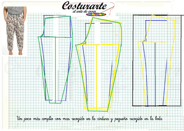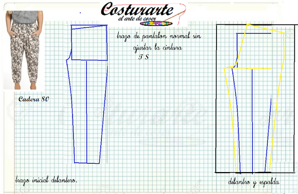 Se usa el patrón básico para no errar en los aumentos aunque se puede hacer con una talla dos veces mayor solo que en esta forma podemos calcular mejor las proporciones de que tan amplio lo queremos. Con un patrón base de la talla requerida seguimos los mismos pasos para construir un pantalón amplio y cómodo.