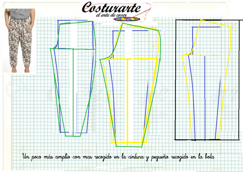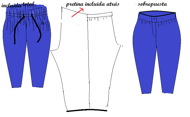 Tenemos un pantalón amplio que interpretaremos de dos formas: Con pretina postiza, cremallera adelante, o con resorte en la parte de atrás o pretina incluida con resorte y cordón para ajustar sin descartar otras opciones que podrán escoger a su gusto,