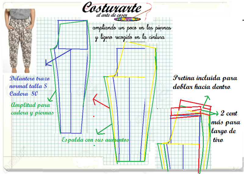 El método que les he estado presentando para trazar un pantalón básico llega a la cintura de tal manera que después se ajusta de acuerdo al diseño, en este caso es un pantalón amplio de cadera y piernas, para lograr su armonía se hace necesario también ampliar el largo de tiro y esto se logra aumentando 2 centímetros aparte de la pretina.