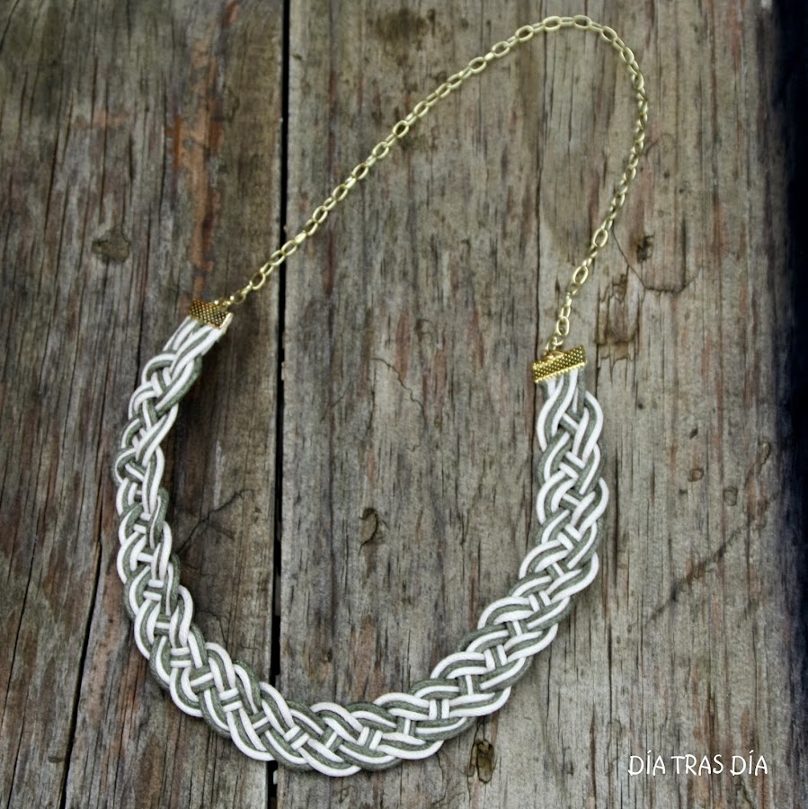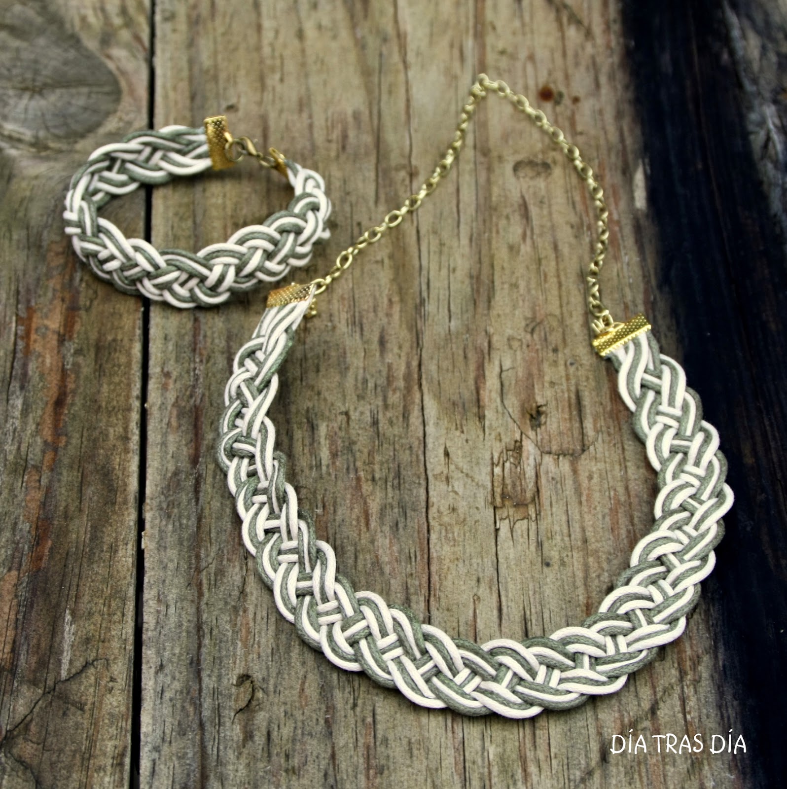 Yo decidí hacer un collar en ese estilo y acompañarlo de una pulsera a juego. Y este fue el resultado de mi prueba, para la que combiné cintas de algodón de dos colores neutros, de forma que pueda resultar más ponible a la hora de combinar con la ropa: