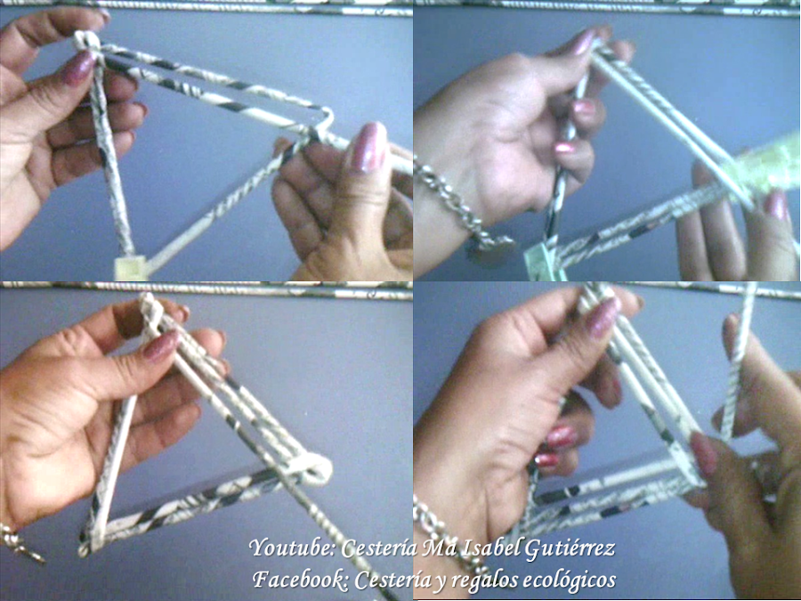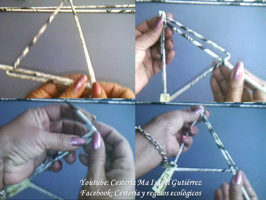 Vamos a formar el triángulo basadas en los dobleces que hicimos, pasando la varilla por detrás del ángulo de la esquina donde unimos y llevándola hacia la siguiente esquina. Ponemos una pinza para que no se zafe, luego volvemos a rodear el ángulo de esa esquina, pasando por atrás y sacando hacia arriba... y ese va a ser el procedimiento: con la varilla, pasar por cada esquina rodeando el ángulo y sacando la varilla hacia arriba y hacia la siguiente esquina... De esta manera vamos ascendiendo y dando volumen hacia arriba...