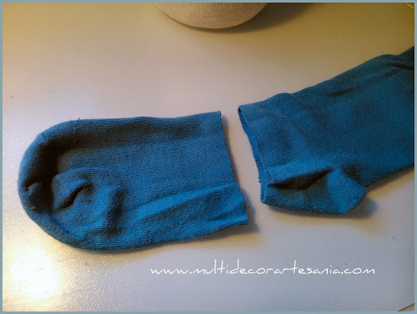 Cortamos el calcetín de color como está en la foto y utilizamos la puntera de este para hacer el gorro de nuestro muñeco. Del resto no hace falta decir nada, jejejeje si es un trabajo de niños y para hacer con ellos, por cierto.