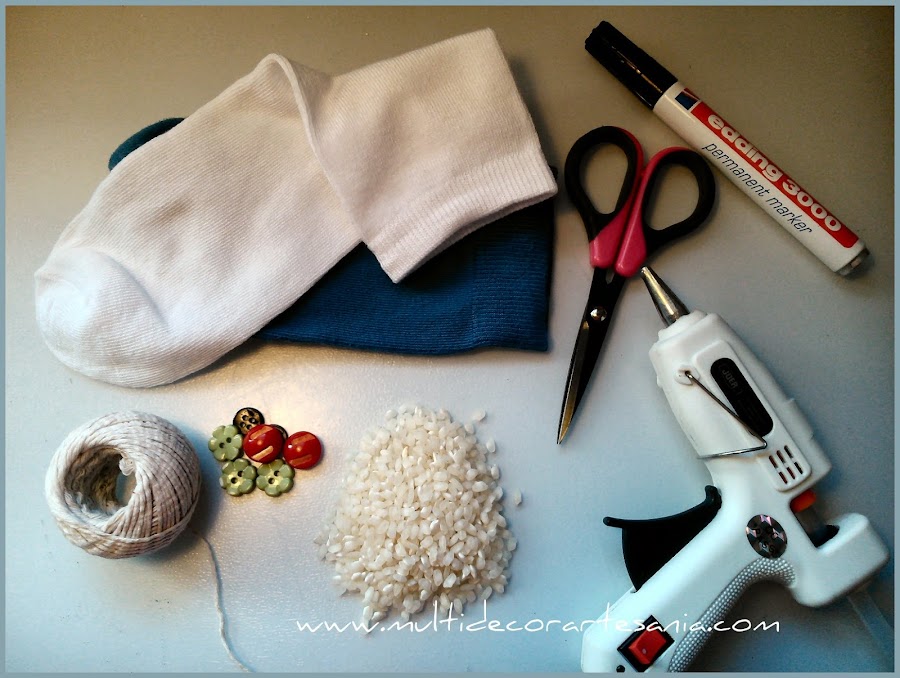 Materiales: Calcetines, botones, cordel, arroz, silicona caliente, tijeras, rotulador... y todo lo que quieras ponerle a tu snowman.