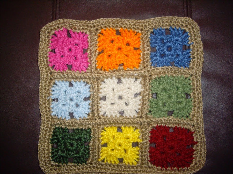 Para realizar el tablero, teji 9 cuadrados en crochet, esto se puede hacer con el esquema de cuadrados que mas les guste, yo use el mismo esquema que tiene el poncho que teji hace un tiempo atras, y lo pueden encontrar en mi blog entre las primeras entradas. Pero a cada uno de estos cuadradros les hice toda una vuelta en medio punto con el mismo color que luego los iba a unir, para que de esta manera me quedara mas prolija la union de los cuadrados. Una vez unidos todos los cuadrados, realice dos vueltas de medio punto recorriendo el borde de mi gran cuadrado.