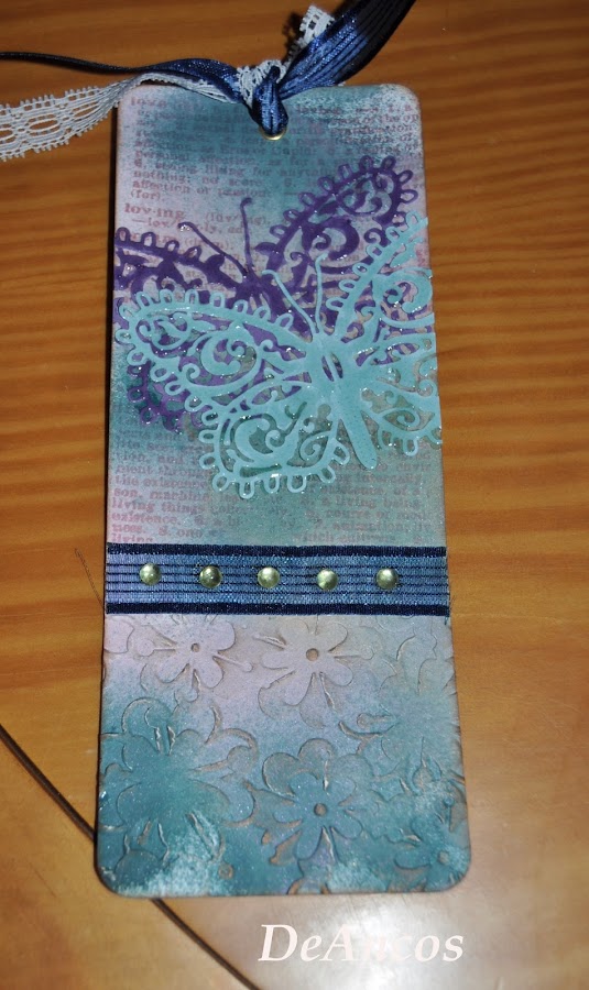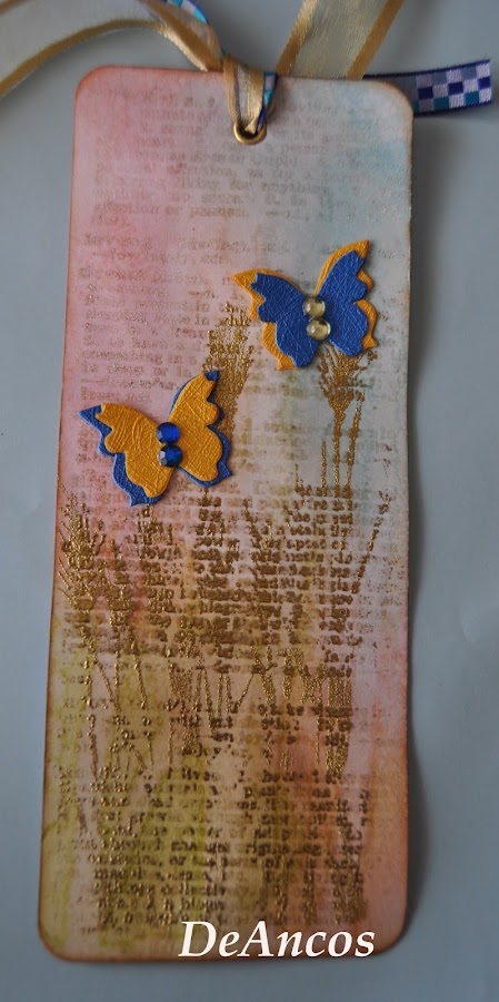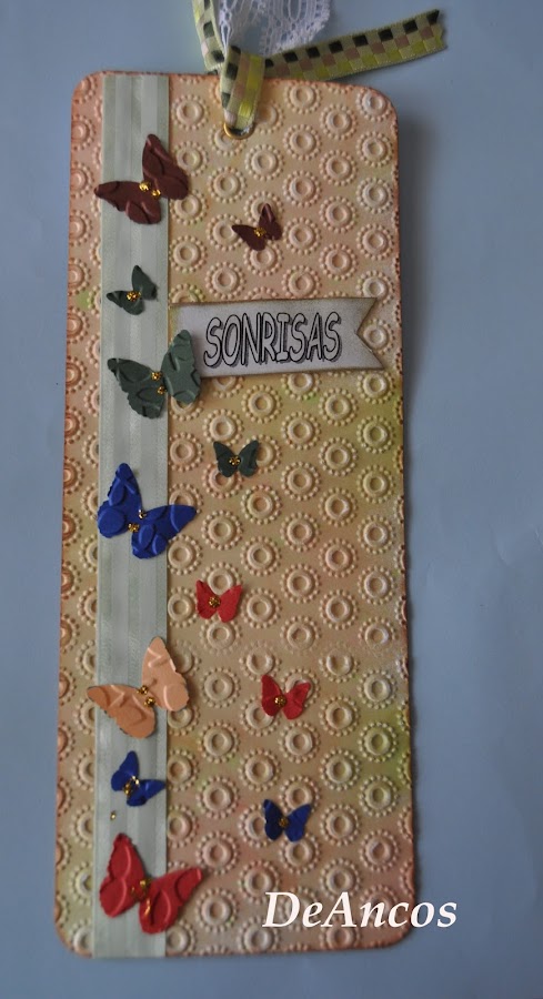 En todos ellos he utilizado la técnica resist y en alguno el doble embossing resist. Sobre un fondo de texto, he variado la decoración teniendo como otro elemento común diferentes modelos de mariposas.