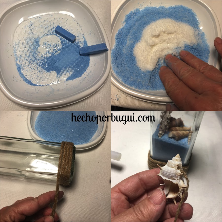 En el fondo de la botella de cristal unos ejemplares de conchitas recogidas en distintos veranos por mi padre.