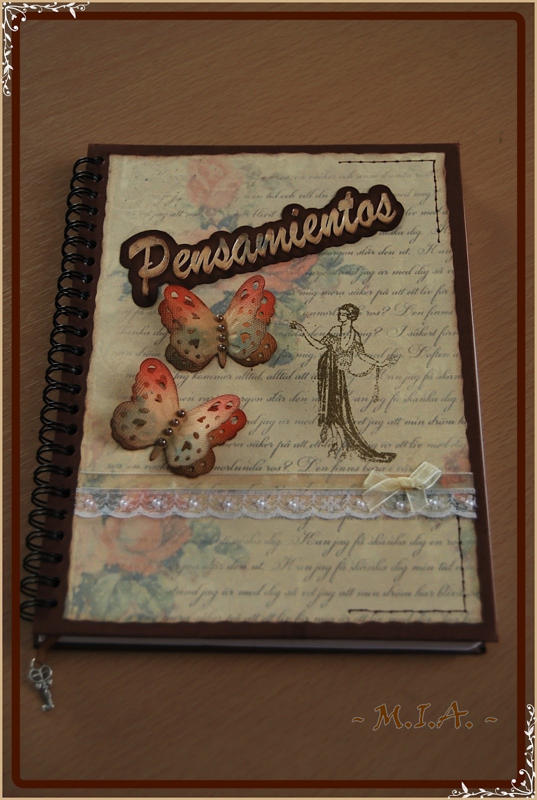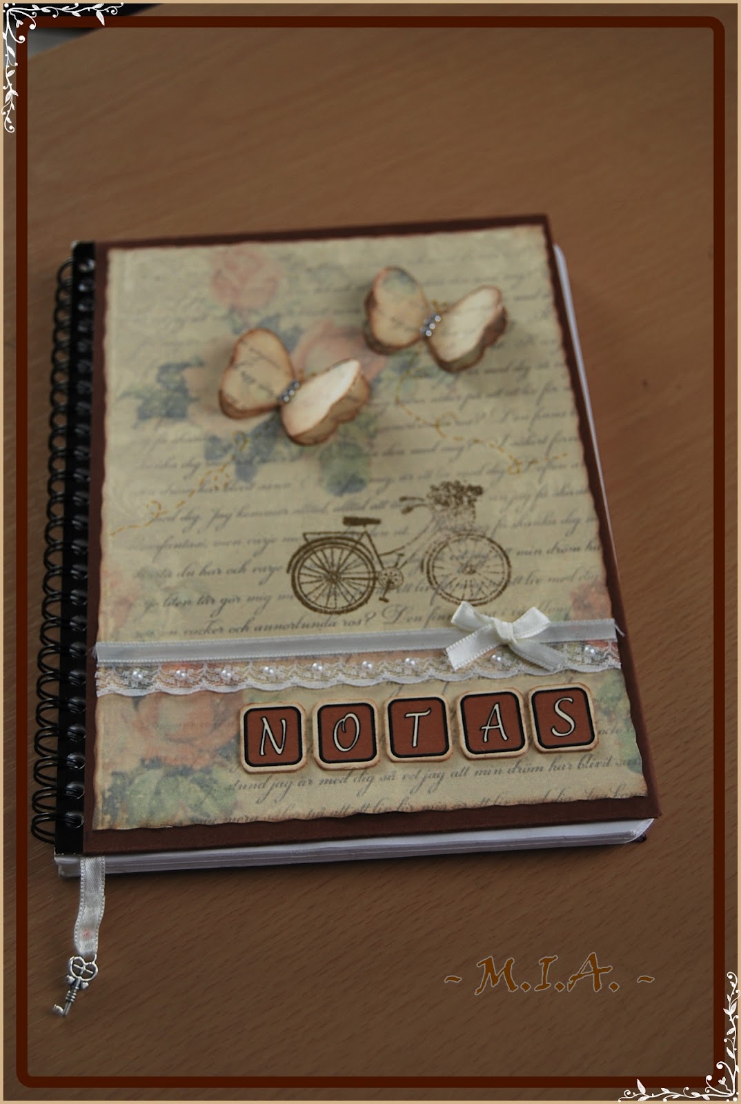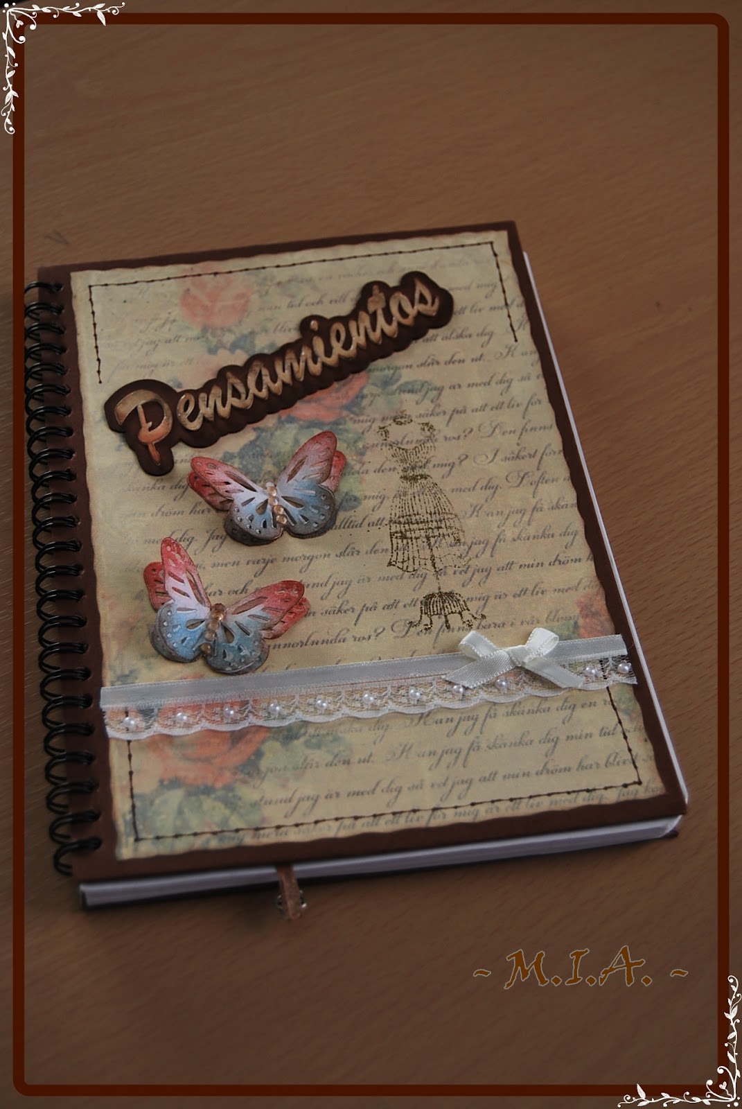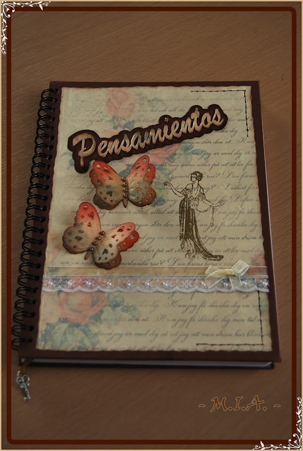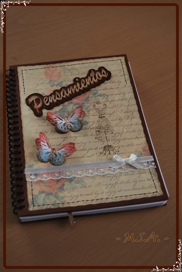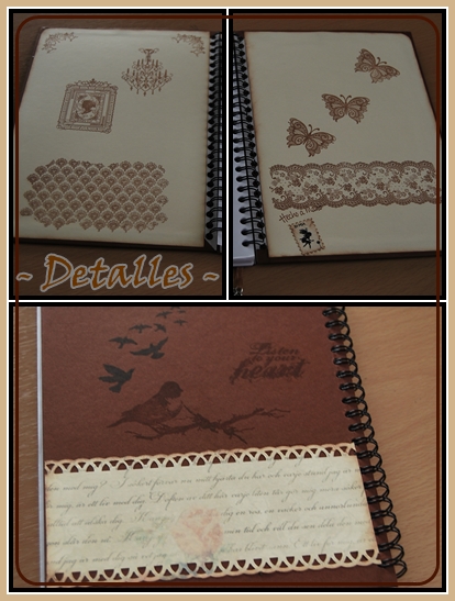 Las libretas están forradas con cartulina marrón chocolate. El papel de fondo no recuerdo de qué colección es y en todas he usado el mismo.