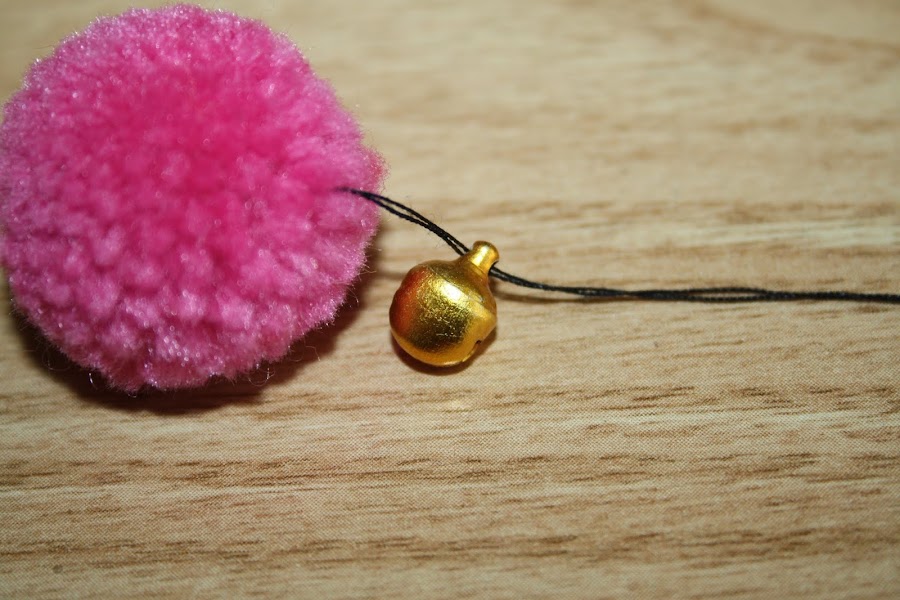 No tiene mucho misterio hacer este tipo de llaveros. Lo primero que haremos será introducir la aguja con el hilo por el pompón, podemos insertar un cascabel y pasamos nuevamente la aguja atravesando el mismo pompón.