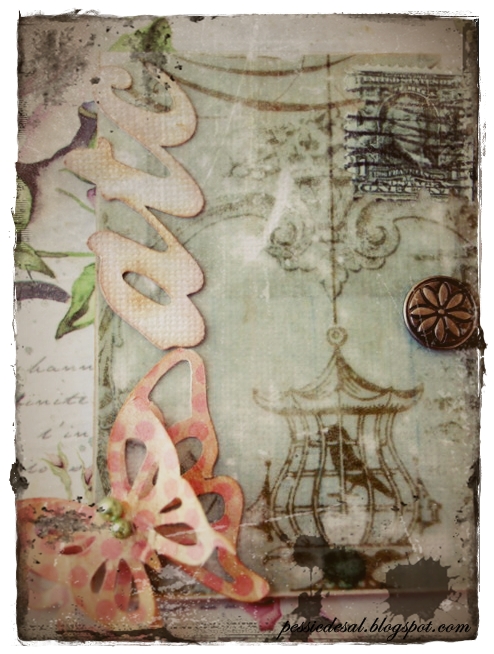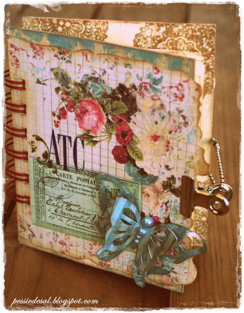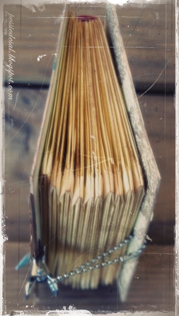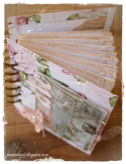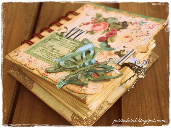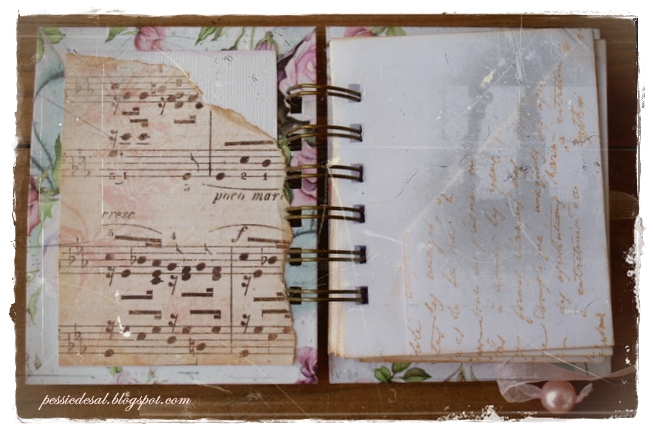 Para el cierre, he utilizado un brad metálico y una cinta de organza con un abalorio. Las hojas interiores son blancas y estampadas con escritura antigua. Las contraportadas adornadas con papel de partitura.