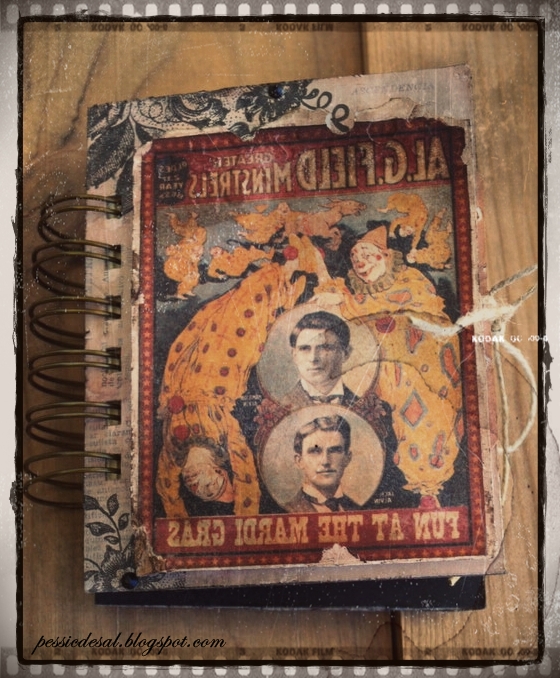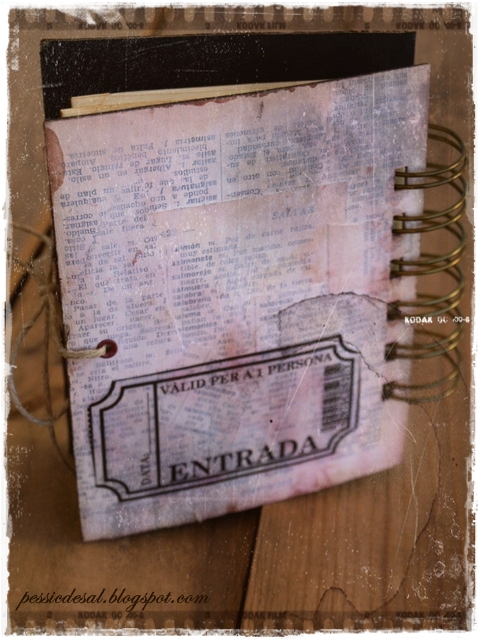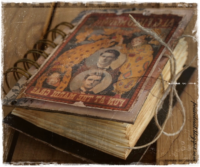 Os voy a enseñar tres versiones distintas; esta primera es la que hice para el taller, muy vintage y con ese toque antiguo y con una transferencia de una imagen preciosa de un papel de graphic 45, inspirado en el circo. El fondo de las tapas está hecho con libro viejo y tintas distress, estampadas después: la imagen queda en 3D y en la parte de atrás una transparencia con una entrada impresa, para colocar una fecha o unas palabras si nos apetece.