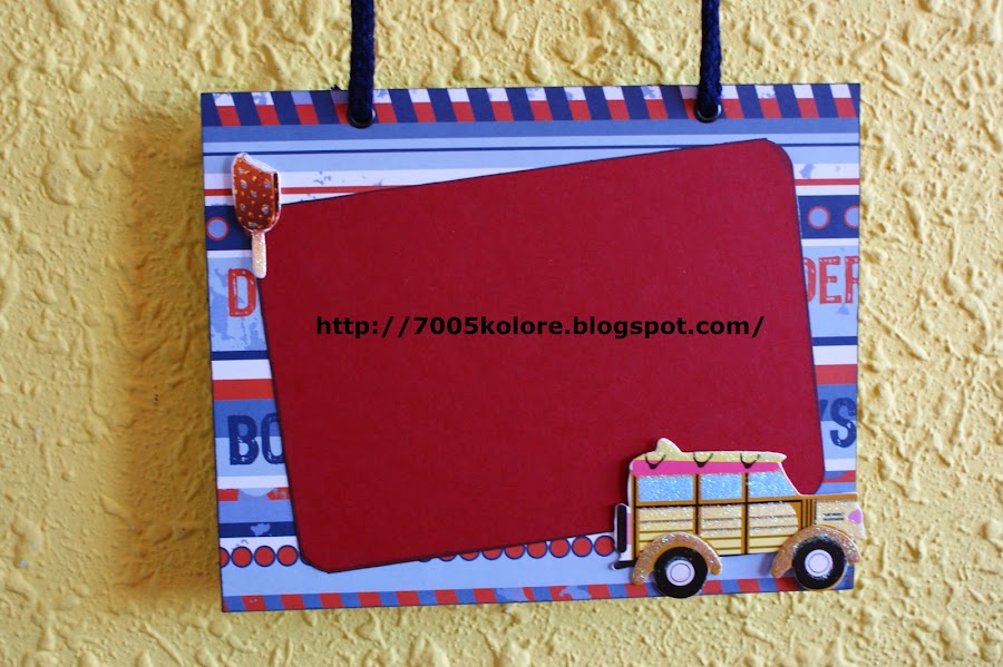 Para este trabajo he utilizado papeles de Kaisercraft de la colección Explore, ideal para trabajos de chicos, que a veces cuesta encontrar papeles masculinos. He utilizado también unos adhesivos con motivos de viajes, cartulina carson azul marino y granate, eyelets y cordón de algodón azul marino.