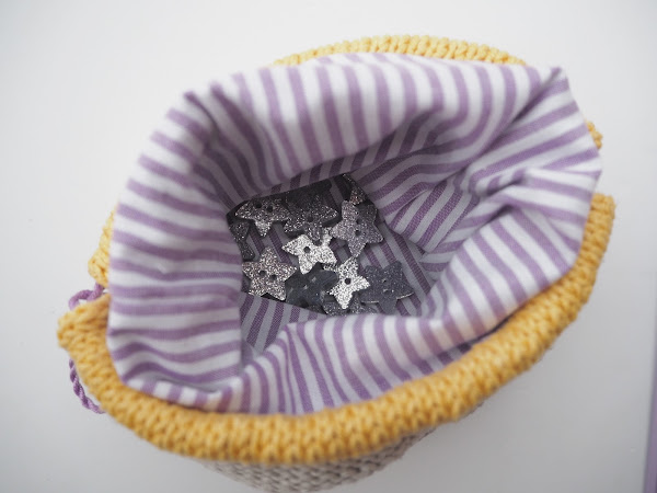 The colours I have chosen are one of my favorite colour combos: grey, mustard yellow and purple. At first I thought of using a fabric with black stripes for the lining (you can see it here) but when I chose the colour for the closing I thought that it would look much better with purple stripes.