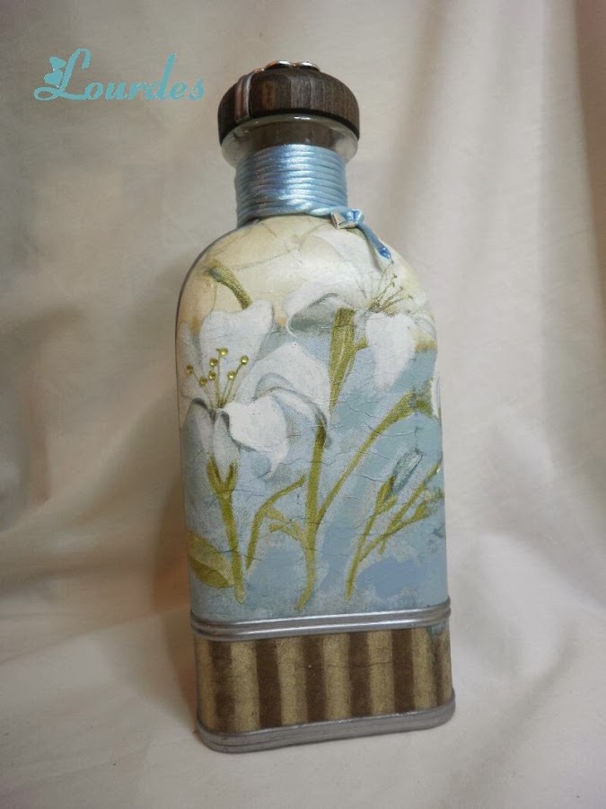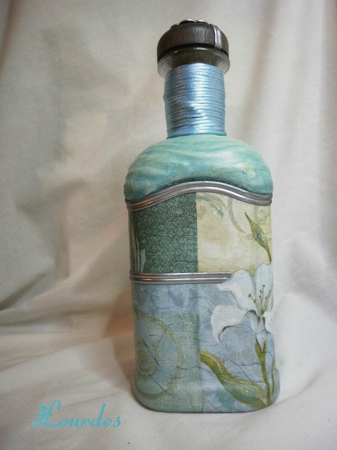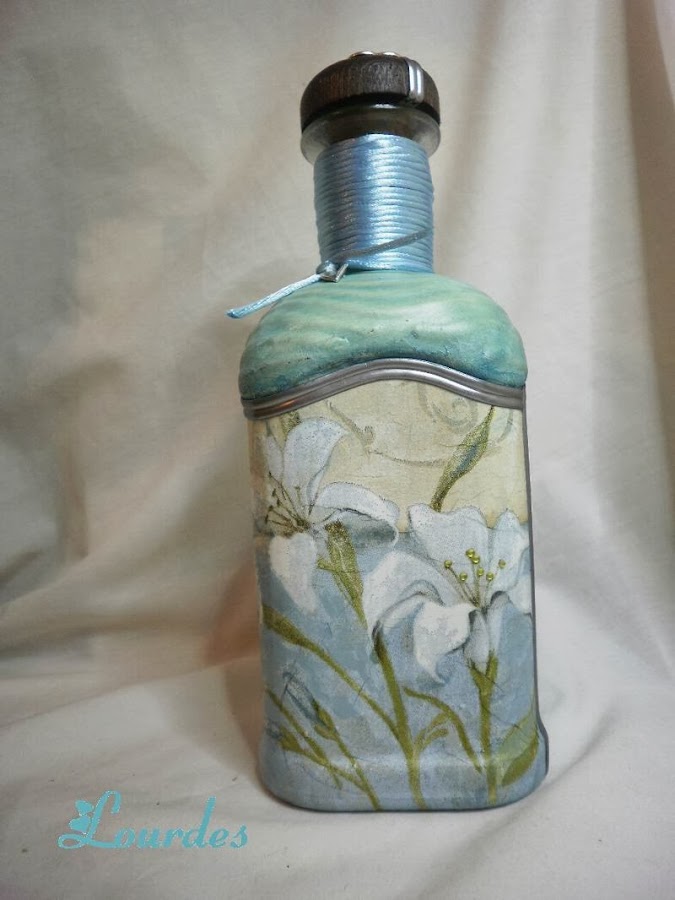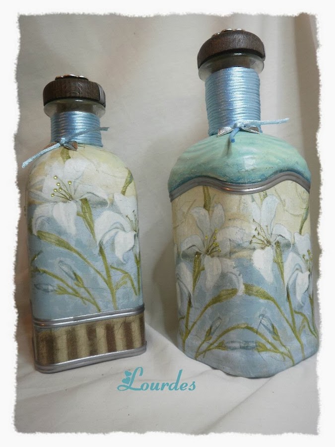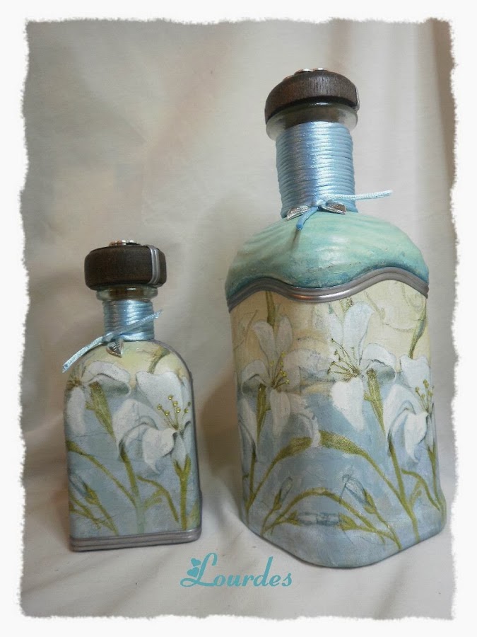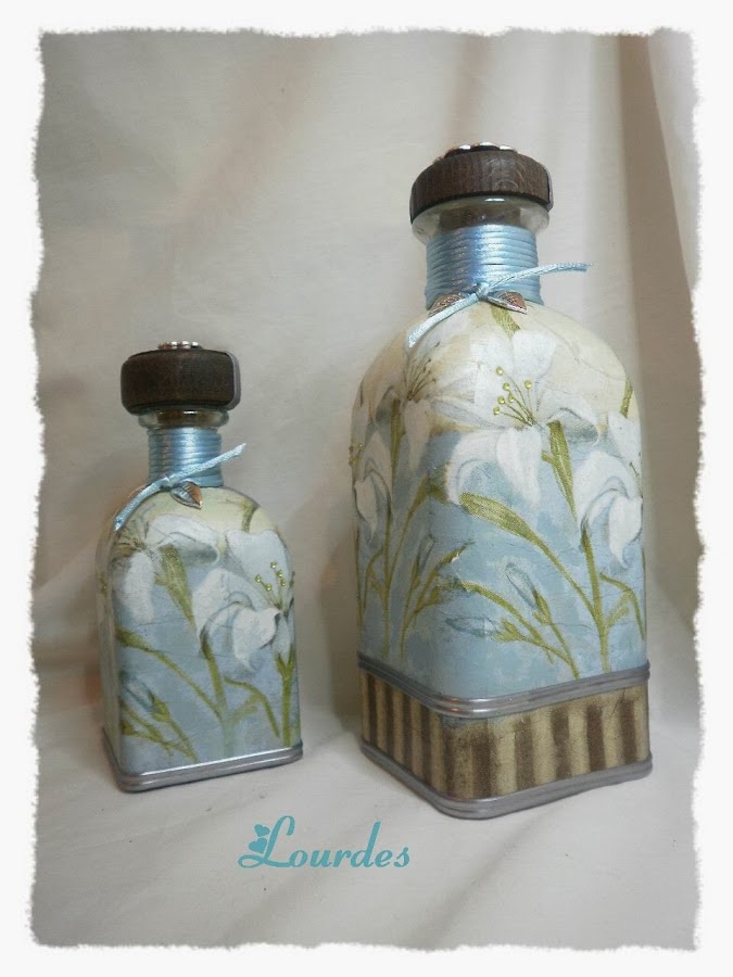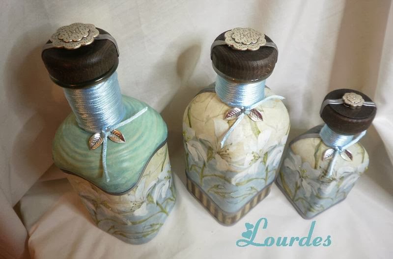 Tres botellas diferentes con el mismo fondo de servilleta, decoradas en el mismo estilo pero que son únicas e irrepetibles