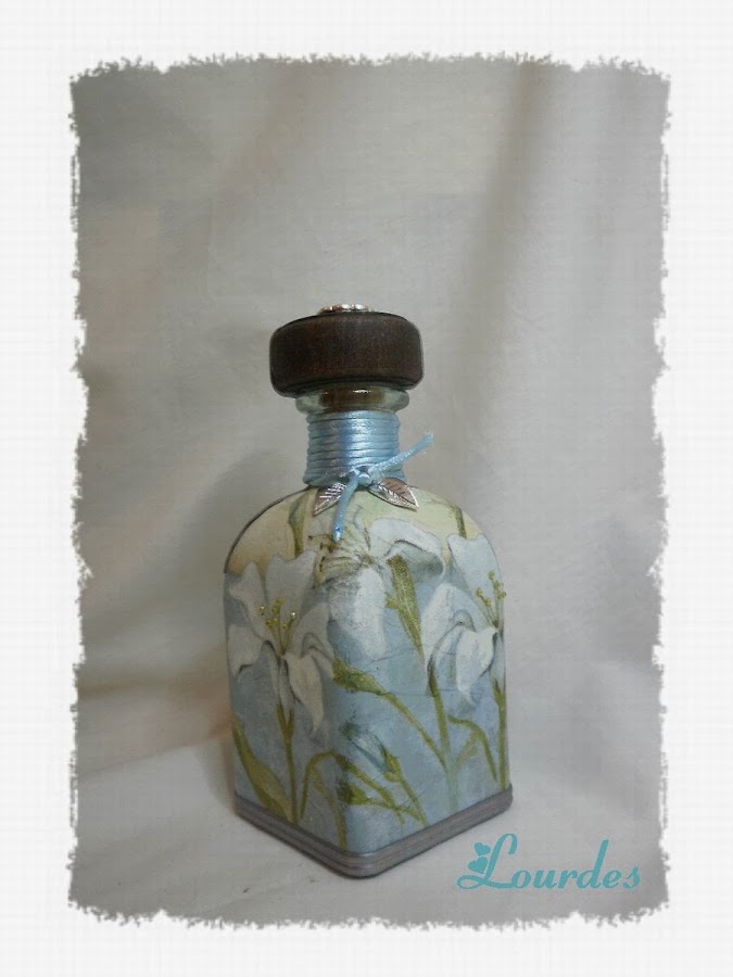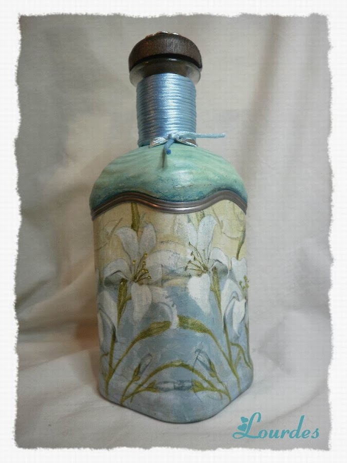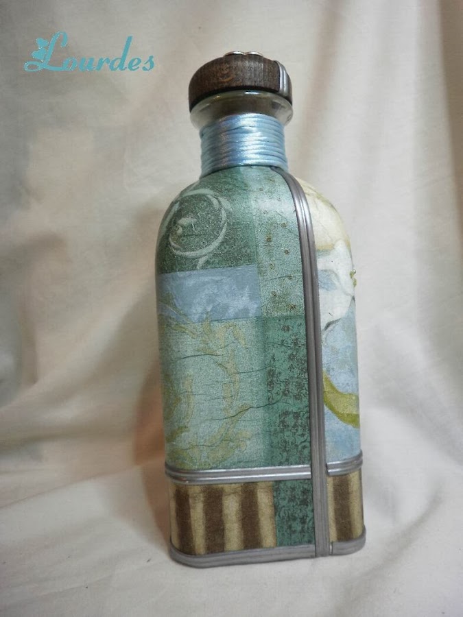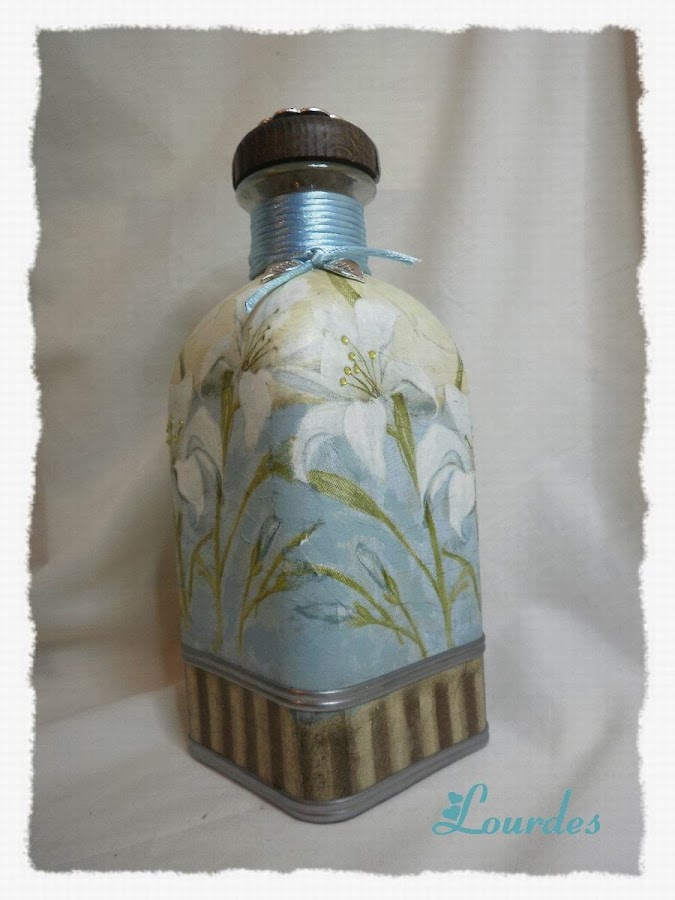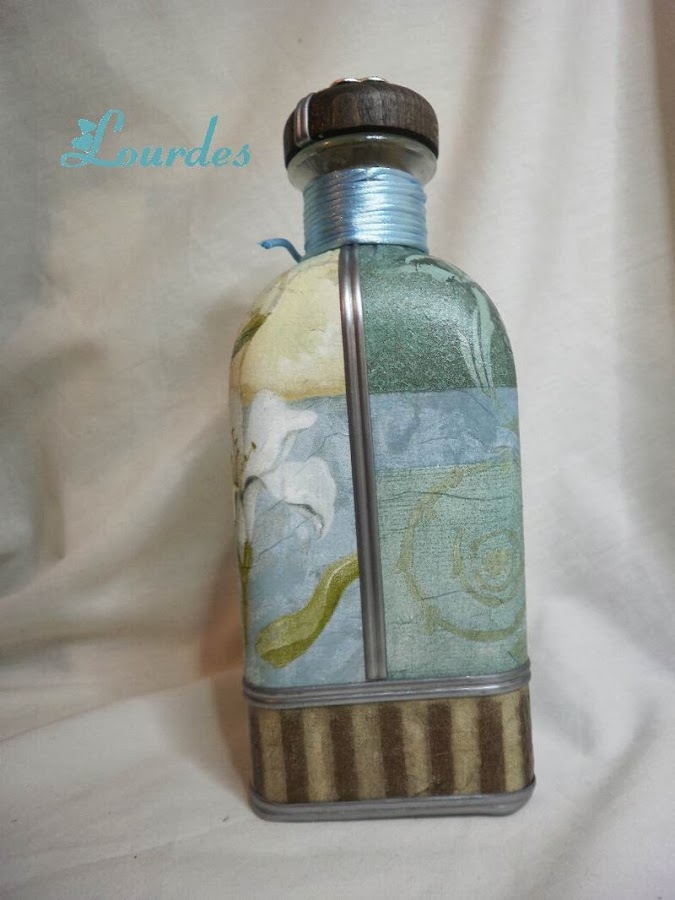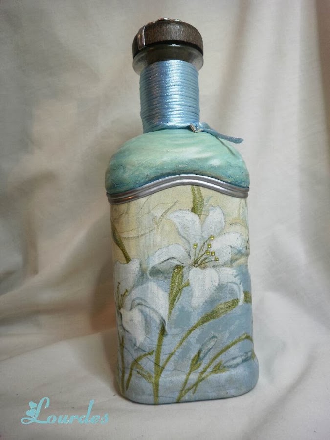 Tres botellas diferentes con el mismo fondo de servilleta, decoradas en el mismo estilo pero que son únicas e irrepetibles