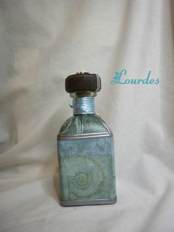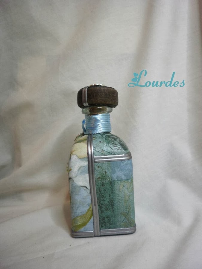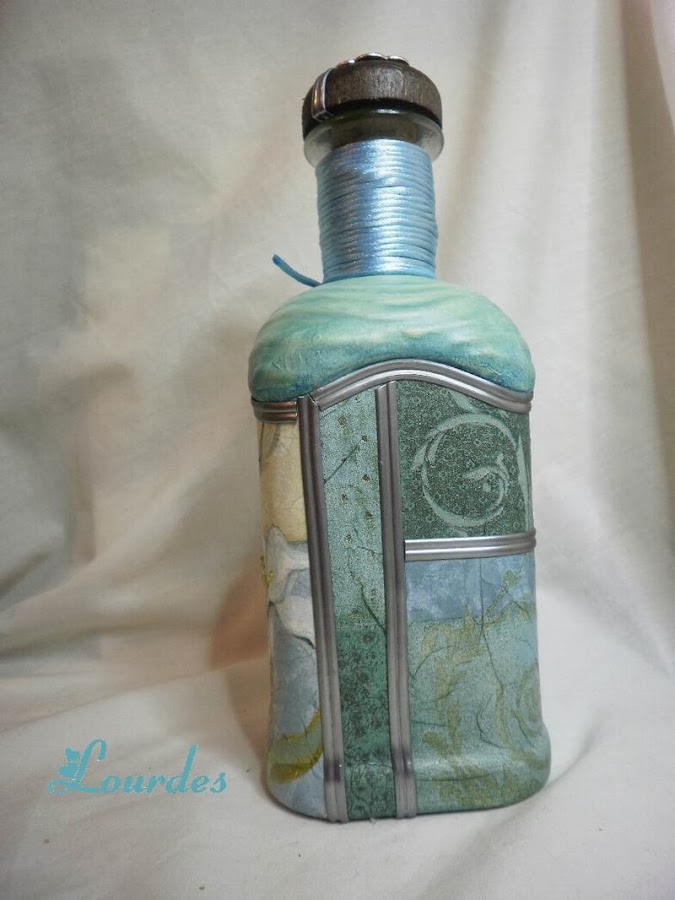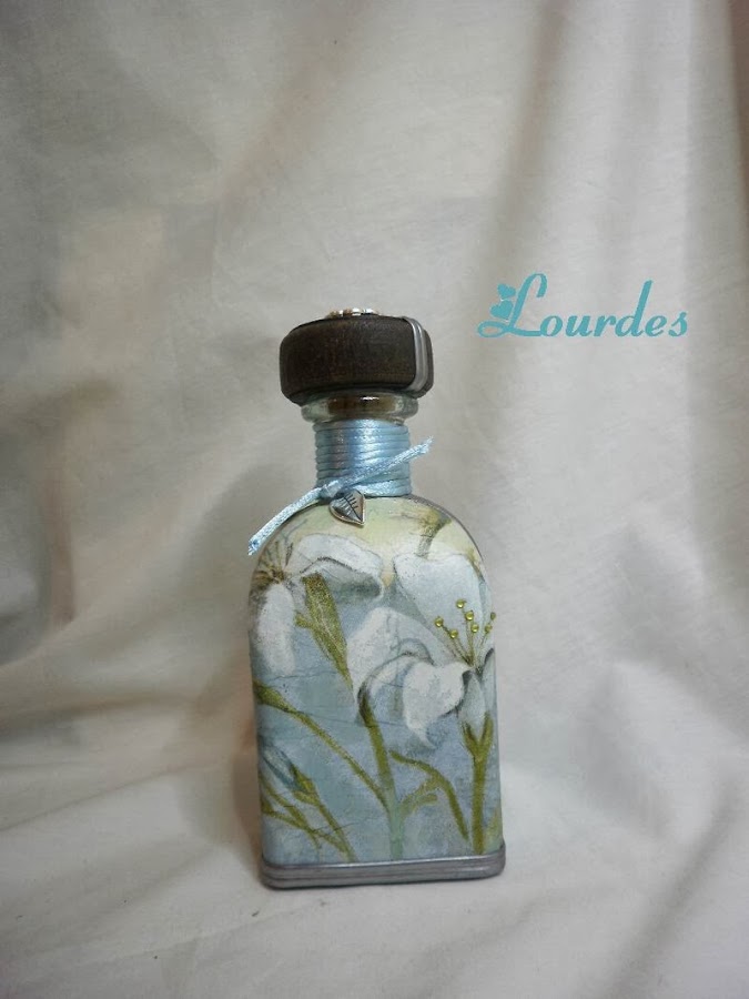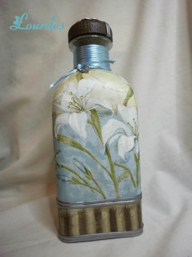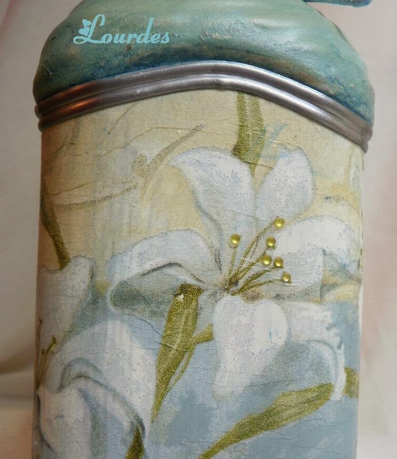 Además del decoupage, llevan adornos metálicos, plomo adhesivo y algunas de sus flores estan decoradas con pequeños cristales
