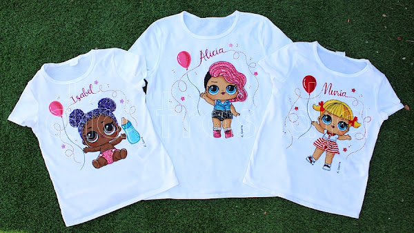 Pues hace poquito, mi prima Elena, que ya me había encargado algunas cosas para la Primera Comunión de su hija Alicia, me dijo que le gustaría que le hiciera unas camisetas con estas muñecas LOL para sus dos peques, Alicia e Isabel.