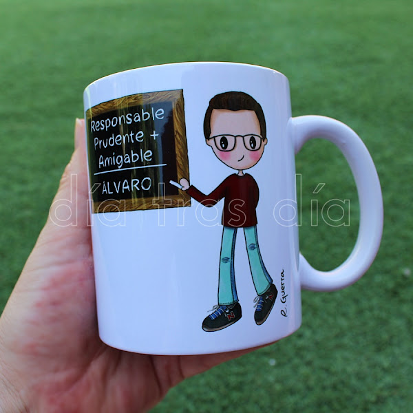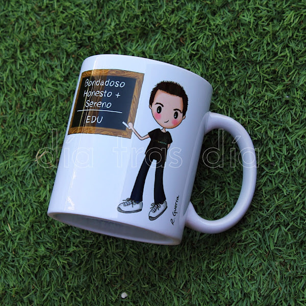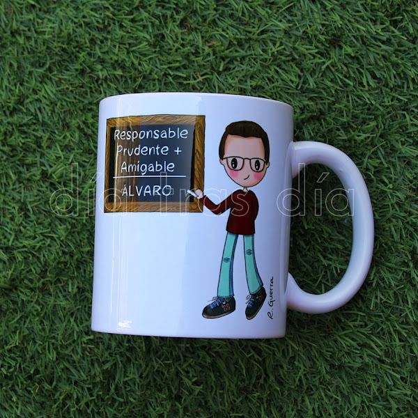 Así que me pidió tazas para Álvaro, Lorena y Edu, en las que aparecieran ellos representados con una pizarra en la que se incluyeran los adjetivos más representativos de cada uno de ellos. Y en la cara posterior de la taza, una dedicatoria.